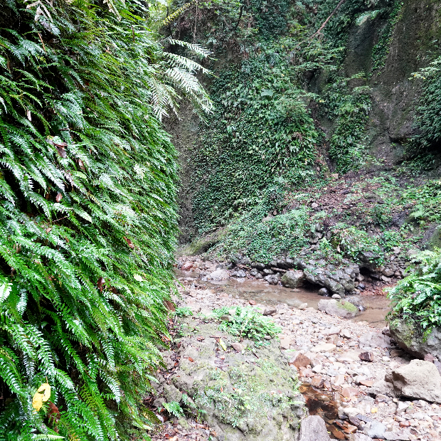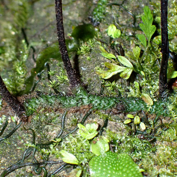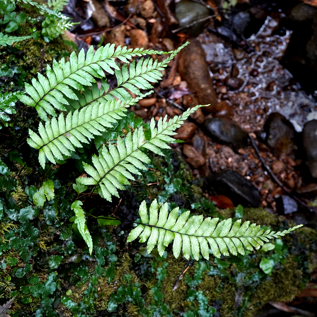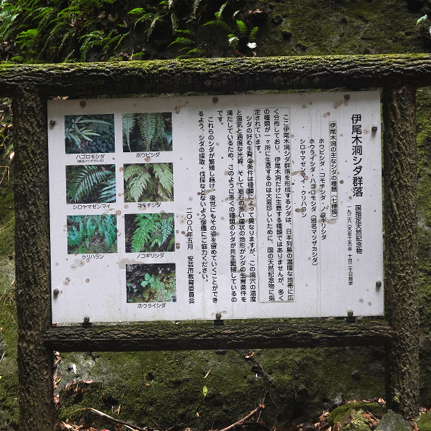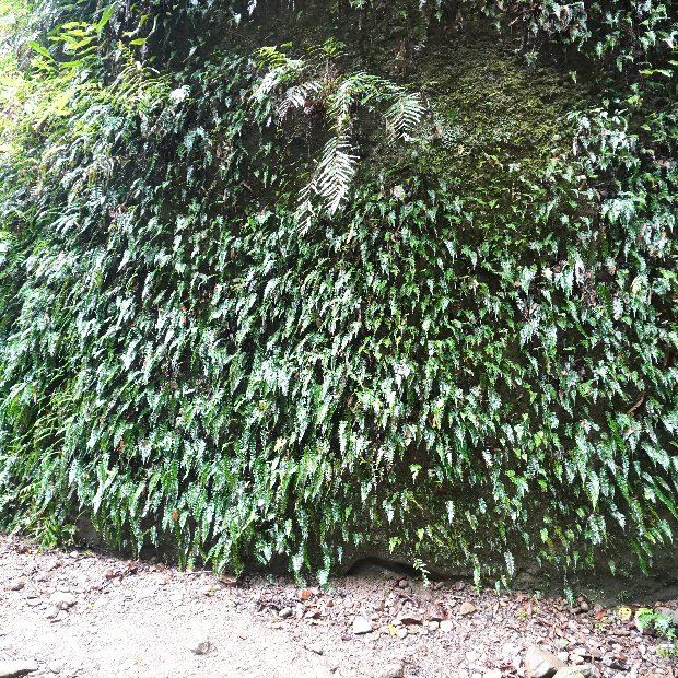 ちなみに現地の看板では7種の見られるシダが紹介されていますが、 実際には40種ものシダが生えているのだとか。 実際に入口から滝までのわずか400mほどの距離で、 筆者が観察したものを希少種除いてリストアップすると、 シロヤマゼンマイ★、 キジノオシダ、 オオキジノオ★、 タカサゴキジノオ、 フモトシダ、 ホラシノブ、 マツサカシダ★、 アマクサシダ、 タチシノブ、 ホウライシダ★、 イワガネゼンマイ、 クルマシダ★、 コウザキシダ、 ホウビシダ★、 ミゾシダ★、 ホシダ★、 イブキシダ、 コモチシダ、 シケチシダ、 ヘラシダ★、 ナチシケシダ、 ノコギリシダ★、 ホソバノコギリシダ、 オニヒカゲワラビ、 ベニシダ、 マルバベニシダ、 トウゴクシダ、 ナガバノイタチシダ★、 イノデ、 オオカナワラビ★、 コバノカナワラビ、 リョウメンシダ、 クリハラン★、 イワヒトデ★、 マメヅタ…。 ※★は個体数が多いもの