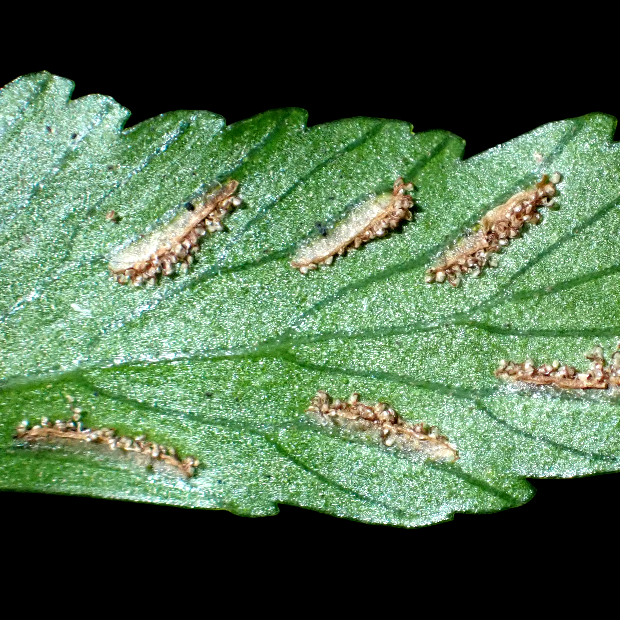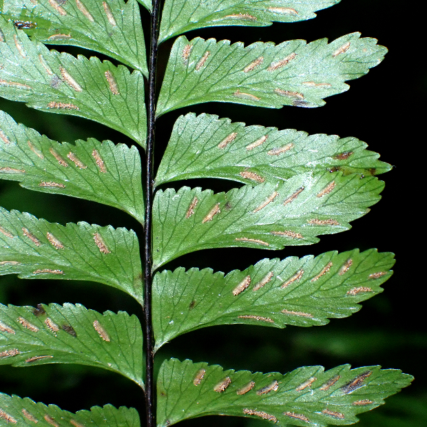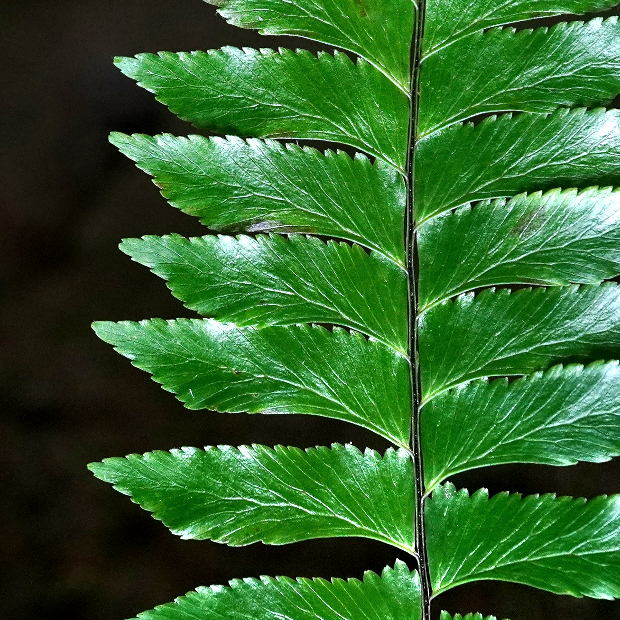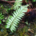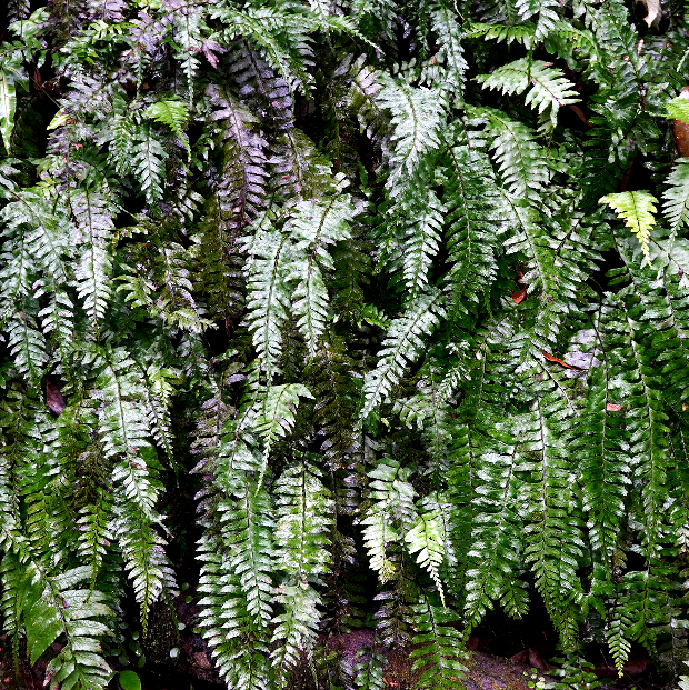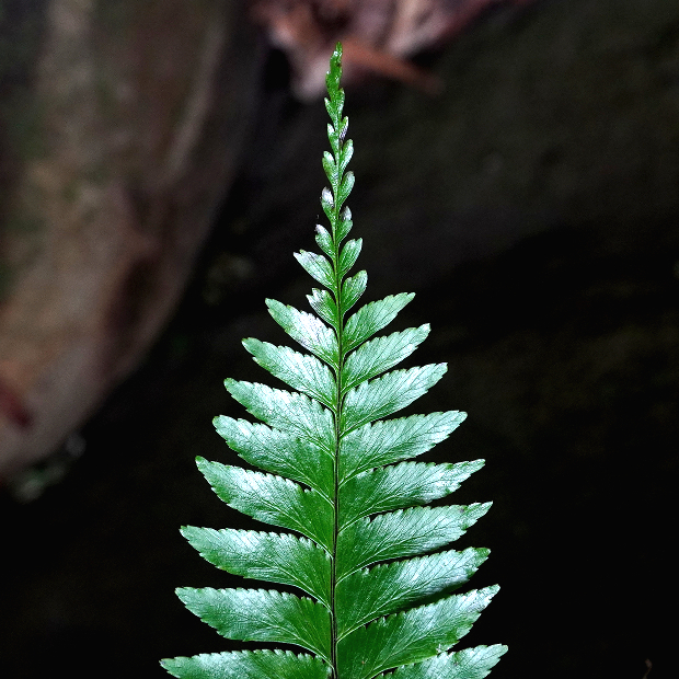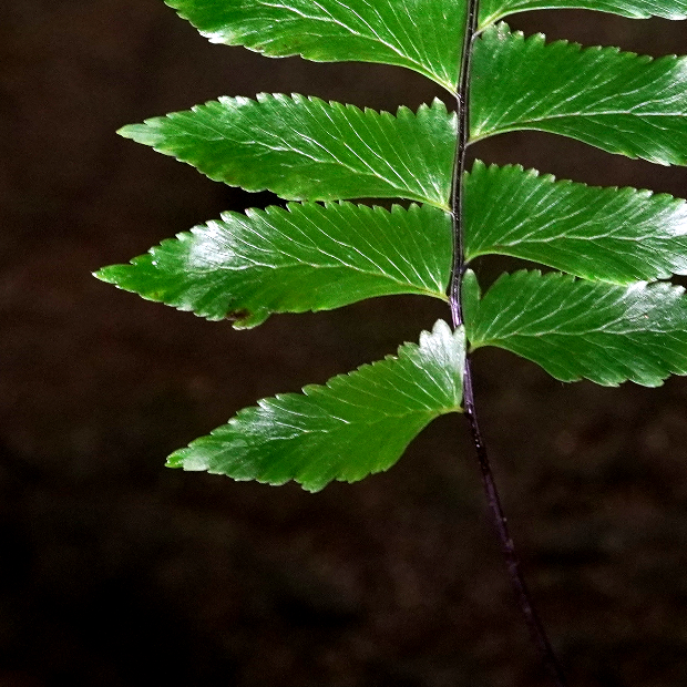 伝説の鳥「鳳凰(ほうおう)」の尾羽に例えられたシダで、 暖かい地域の薄暗くて湿った岩壁によく群生します。 葉先は細く伸び、 羽片は鳥のツバサのような形で、 葉裏に細長めの胞子のう群をつけます。