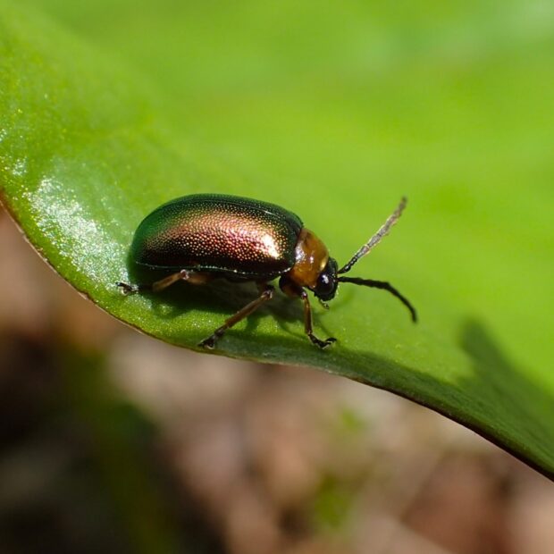 山地で見られる、 金緑色に輝くヒゲナガハムシの仲間。 前胸とあしはオレンジ色で、 上翅(じょうし)は見る角度により、 緑色~赤紫色と、 色が変わります。