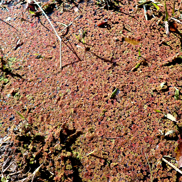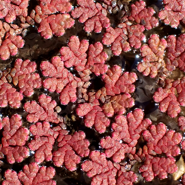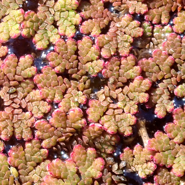 田んぼなどの水面に浮かんで生活する水生シダ。 全体アメーバ状の形をしていて、 ウロコみたいな葉に覆われます。 冬が近づくと紅葉して、 一面を真っ赤に染めることが多いです。 水中に伸びる根には根毛が多くつきます。 アメリカオオアカウキクサ(特定外来生物)とニシノオオアカウキクサ(外来種?)の人工雑種といわれ、 近年各地で大発生して問題になっています。