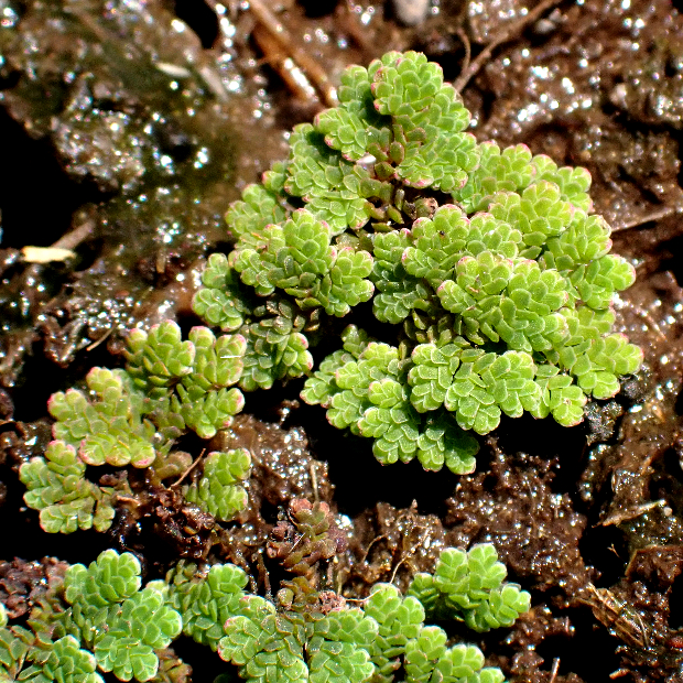 ●アカウキクサ(Azolla pinnata subsp. asiatica) : 絶滅危惧種。 全形は三角状で、 葉のほか茎にも目立つ1細胞の突起があるのは本種のみ。 根には根毛が多い。 ※沖縄に本種と異なる系統が一部野生化しているといわれるが現状不明。