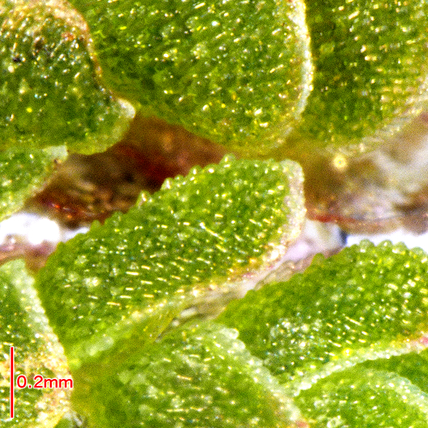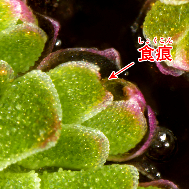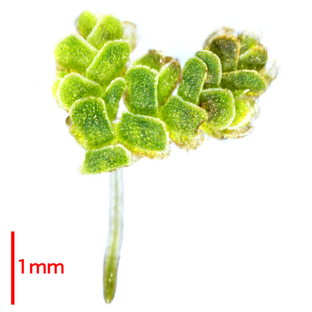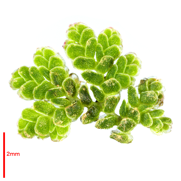 ●オオアカウキクサ(Azolla japonica) : 日本固有種かつ絶滅危惧種。 全形はアメーバ状。 他種よりも植物体が1~7cm、 葉が長さ1~2mmとより大きくなる。 葉の突起は1細胞で目立たず、 根には根毛がほとんどない。
