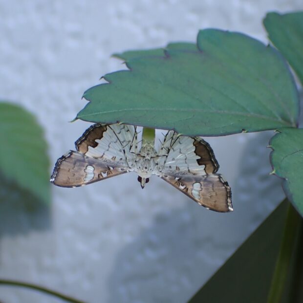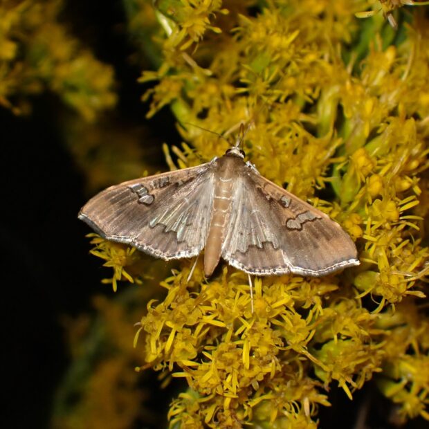 ツトガ科ノメイガの仲間。 幼虫はマメ類を食べます。 昼間に、 草地、 人家周辺で普通に見られ、 秋に増えます。 反り返るようなとまり方に特徴があり、 はねの表と裏の両方を観察することができます。