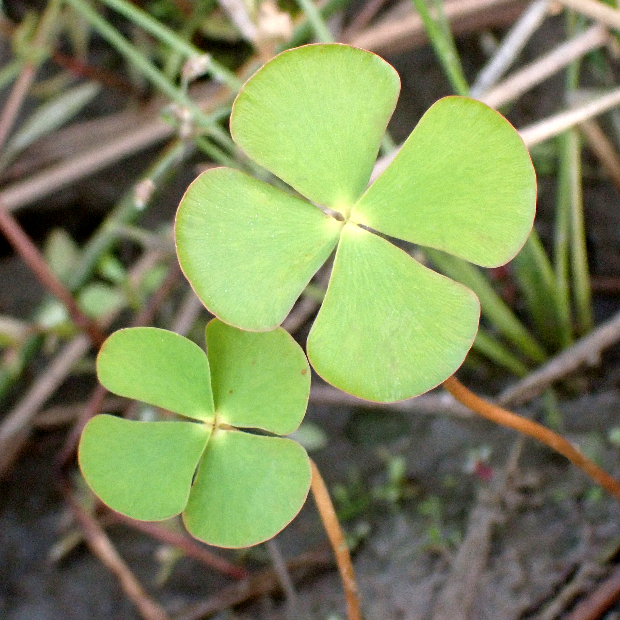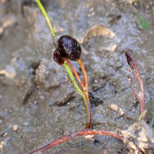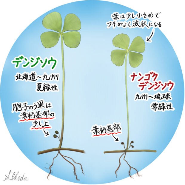 日本に分布する2種はよく似ていて、 葉だけで見分けるのはほぼ不可能です。 はっきりとした違いは胞子のう果の位置。 デンジソウは葉柄基部の少し上につけますが、 ナンゴクデンジソウは葉柄基部につけます。 ただデンジソウでもまれに葉柄基部につけていることがあるので、 複数の胞子のう果を確認することがよいとされます。