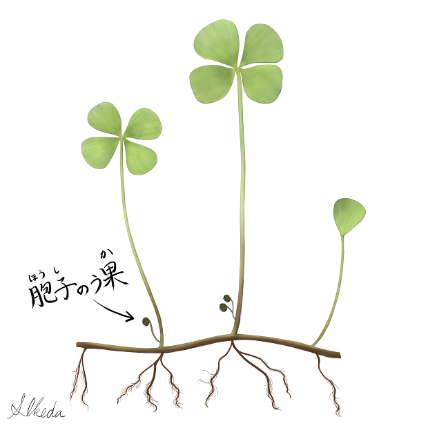 田んぼなどに生える水生シダ。 四葉のクローバーのような見た目をしていて、 シダなので花は咲かず、 葉柄に胞子のう果をつけます。 名前は葉の形が田の字に似ていることが由来です。