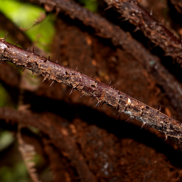 ヤシの木のように育つ大きなシダ。 琉球に多いヒカゲヘゴとよく間違われますが、 ヒカゲヘゴほど高く育たず、 枯れた葉が垂れて長く残ること、 葉柄にトゲが多いことなどが本種の特徴です。 本州や四国にもわずかに見られますが、 木のように高く育つことはまれです。