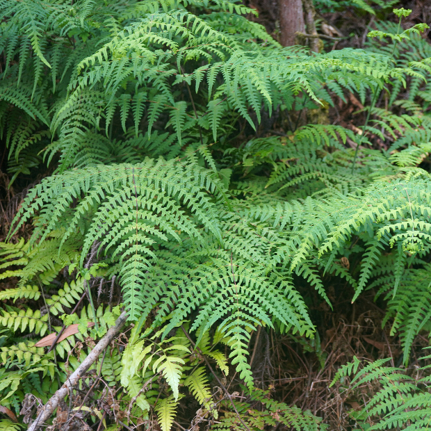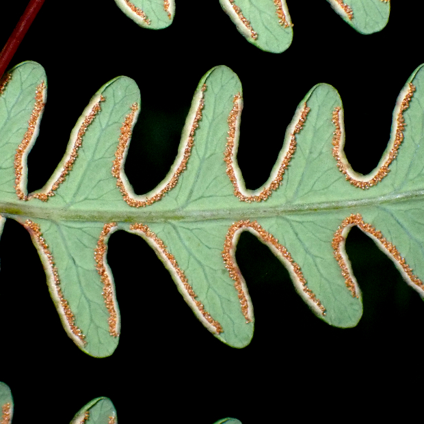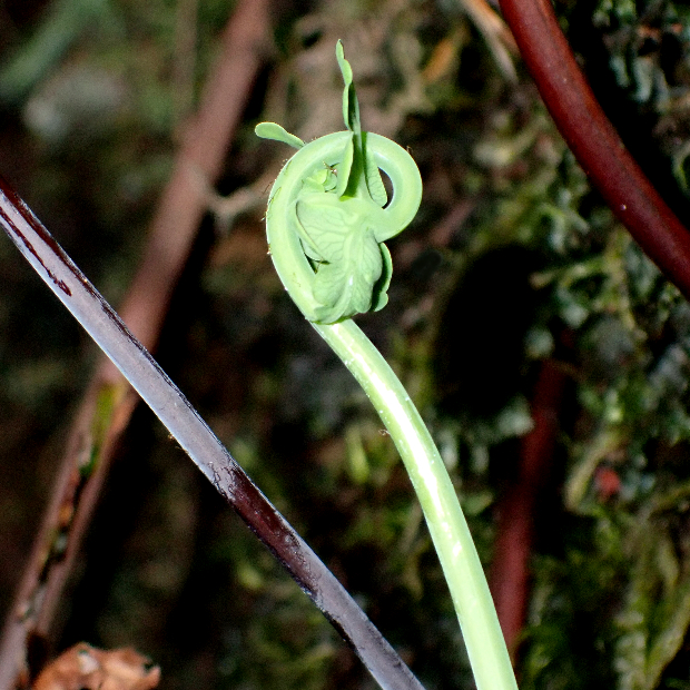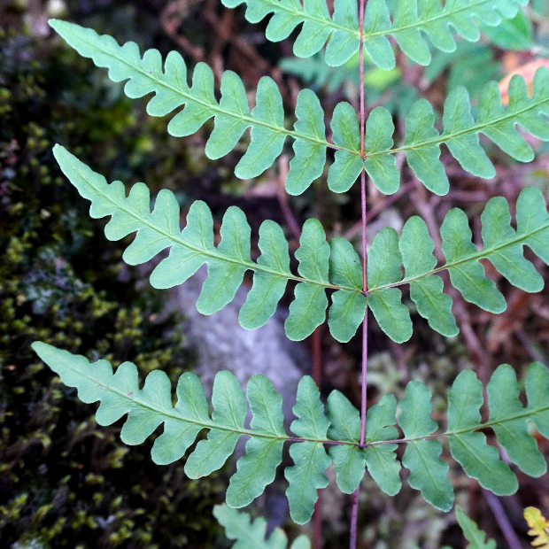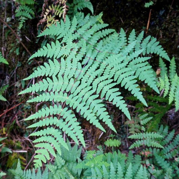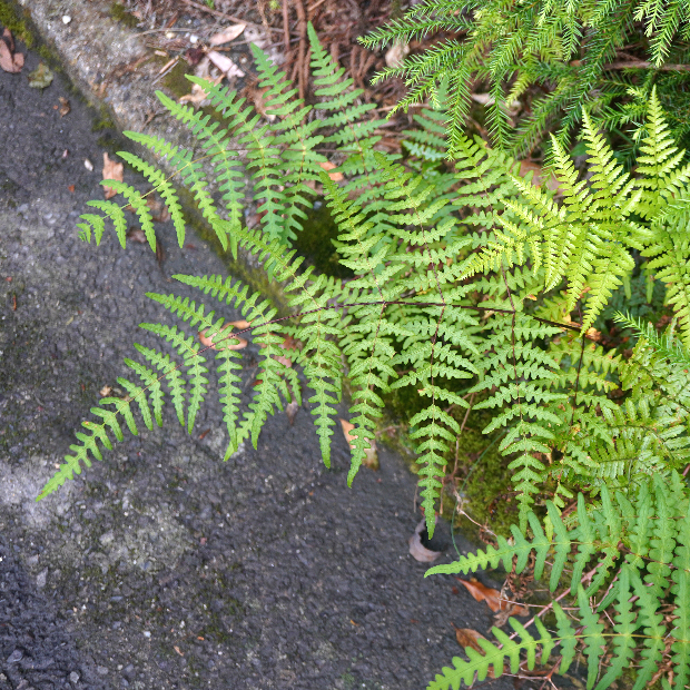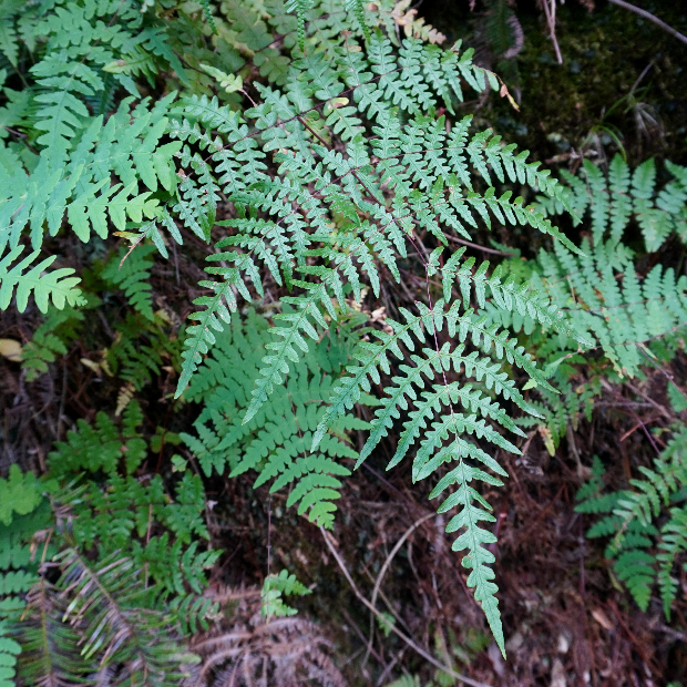 暖かい地域の温泉近くなどに生える大きめのシダ。 ワラビに近い仲間で少し似ていますが、 葉はやわらかくて切れ込みは幅広く、 葉柄や葉軸は赤色っぽいです。 日本での分布は限られますが、 屋久島や三宅島など場所によってはよく見られます。