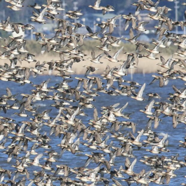 基本的に群れで行動し、 多く飛来する地域では数百羽の群れを作ることもあります。 少ない場所ではコガモなどの他のカモ類の群れに混じって活動することもあります。