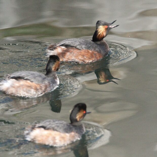 群れで行動する小型のカイツブリ