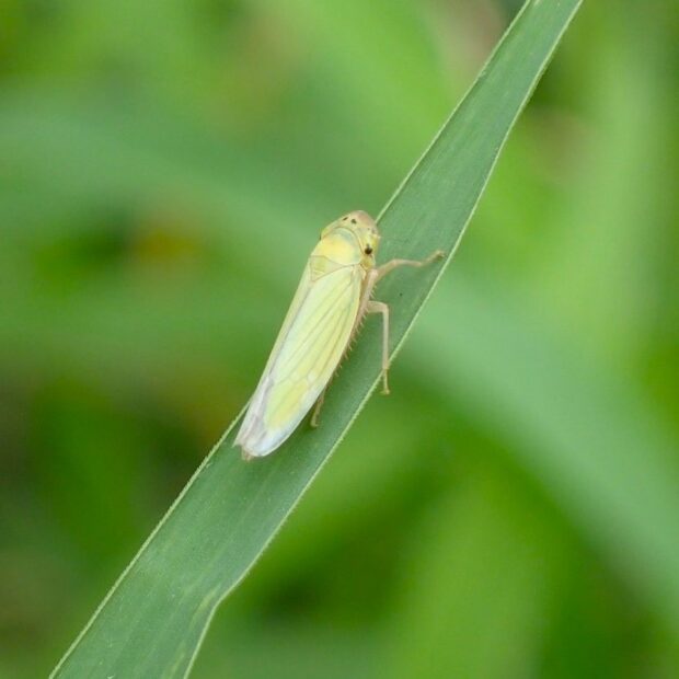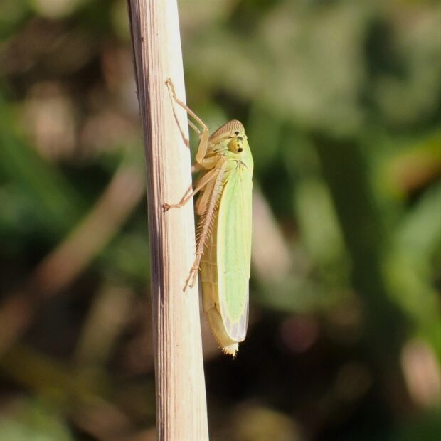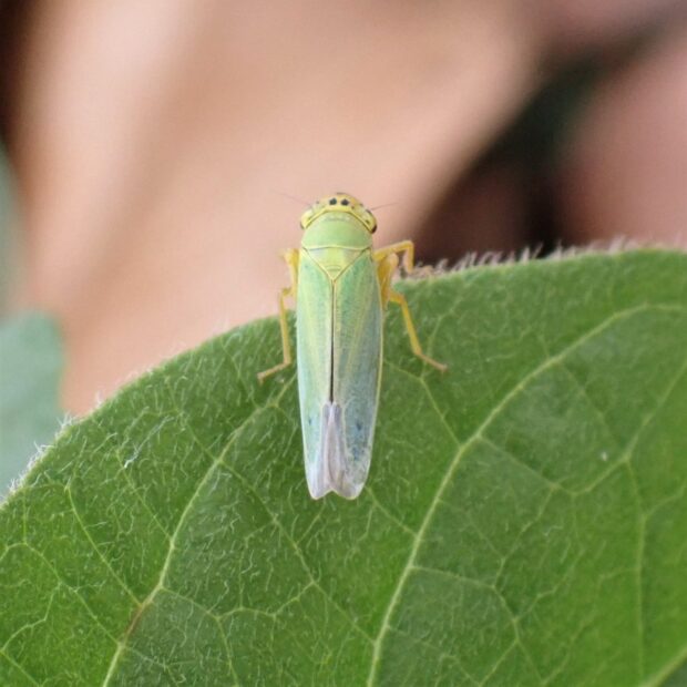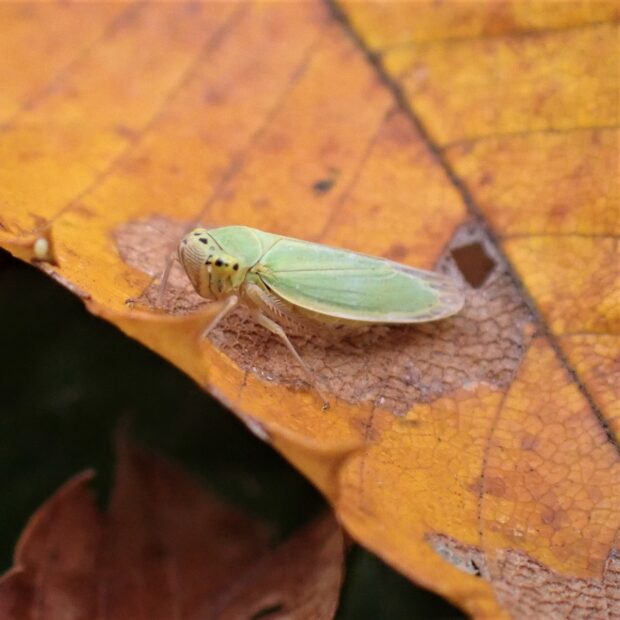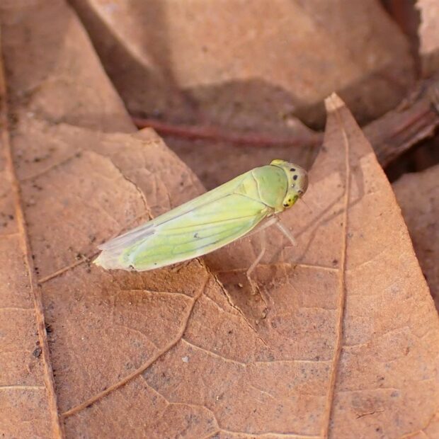 頭に黒い点々があるヨコバイ。 小さいですが、 ヨコバイとしては大きな方で、 草はらで普通に見られます。 危険がせまると、 はねて逃げます。