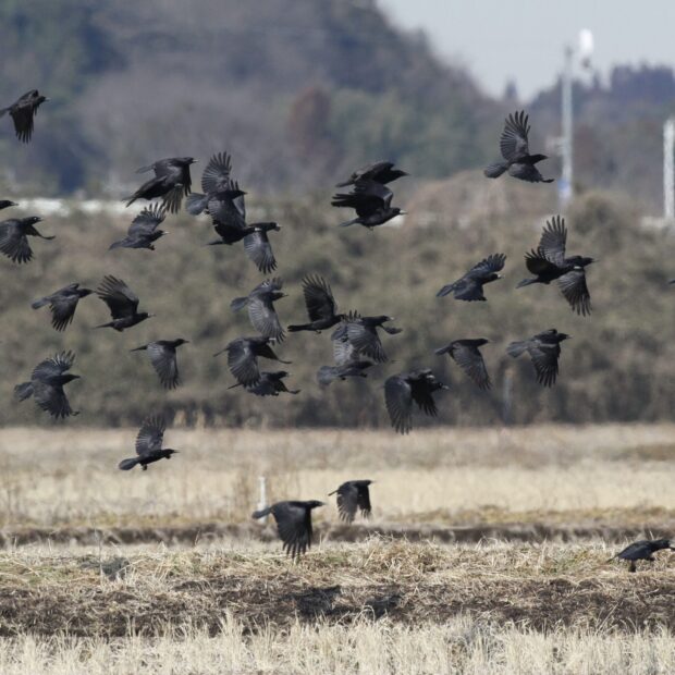 冬鳥として主に農耕地や草原などにやって来る渡り鳥のカラスです。 かつては、 九州などに冬鳥として渡ってきていたのですが、 今では分布域を広げて全国的に見ることができます。