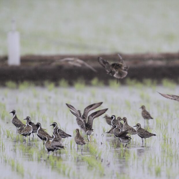 主に旅鳥、 南西諸島では冬鳥として、 水田や畑などにやってきます。 海辺の砂浜や干潟などでも見られないことはありませんがまれです。