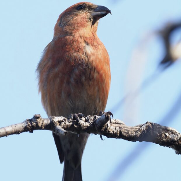 基本的に群れで生活し、 針葉樹の種などを食べます。 互い違いになっている独特の嘴で松かさをこじ開け、 タネを取り出します。