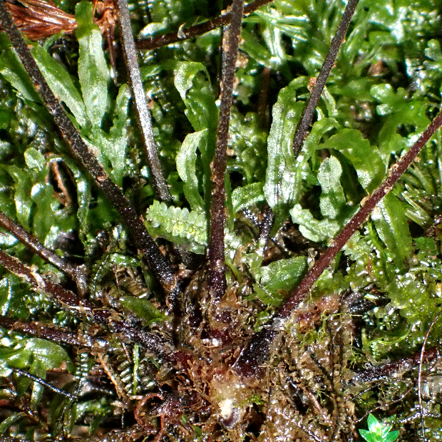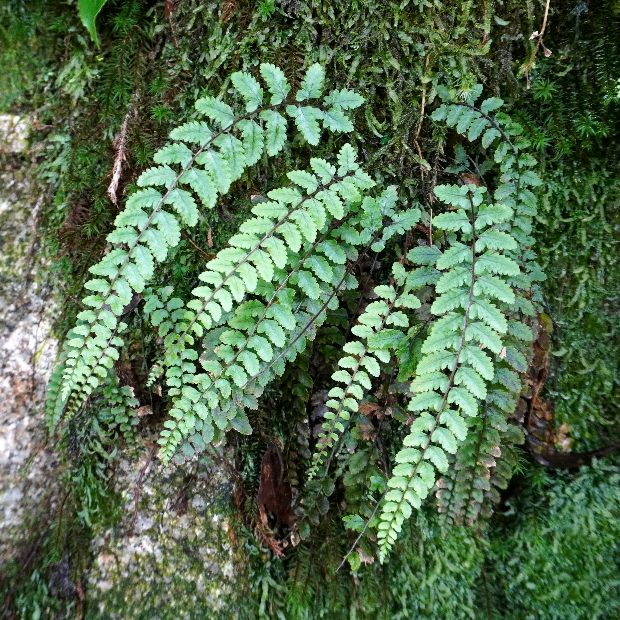 日本では屋久島と、 近年になって和歌山県でも見つかったシダ。 湿った斜面から紫色を帯びた葉を多く垂らします。 その姿は美しい鳥の尾羽のようです。
