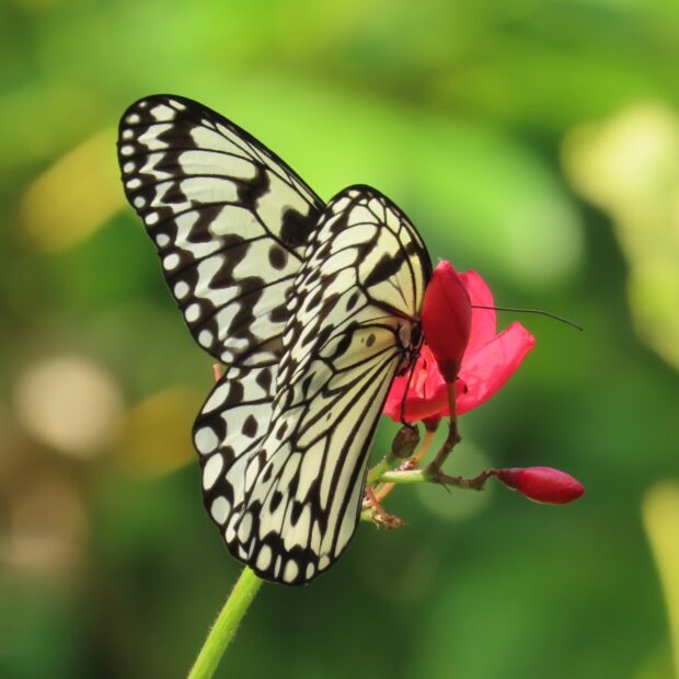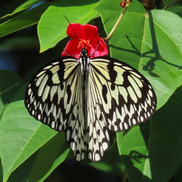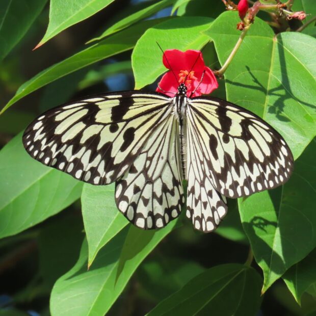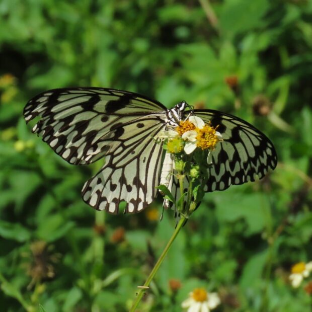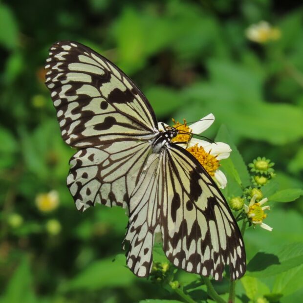 白地に黒いまだら模様が特徴のタテハチョウの仲間。 日中、 フワリフワリとゆっくり滑空するように飛びます。 幼虫は毒を持つ葉を食べることで毒を体内にため込み、 その毒は蛹や成虫にも残っています。 「南国の貴婦人」「新聞蝶」とも呼ばれます。 2020年に沖縄県のチョウに指定されました。