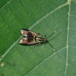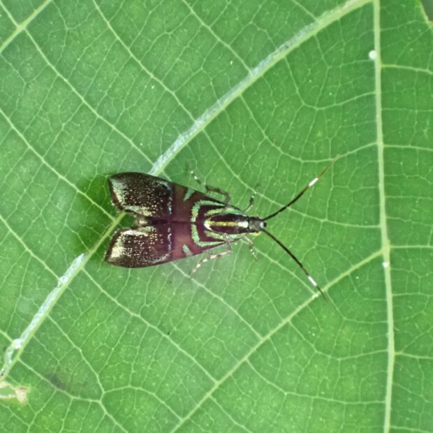 ハマキモドキの仲間。 ハマキモドキの中では大型で、 光があたると、 キラキラとした輝きがあります。 葉の上でよく見られます。