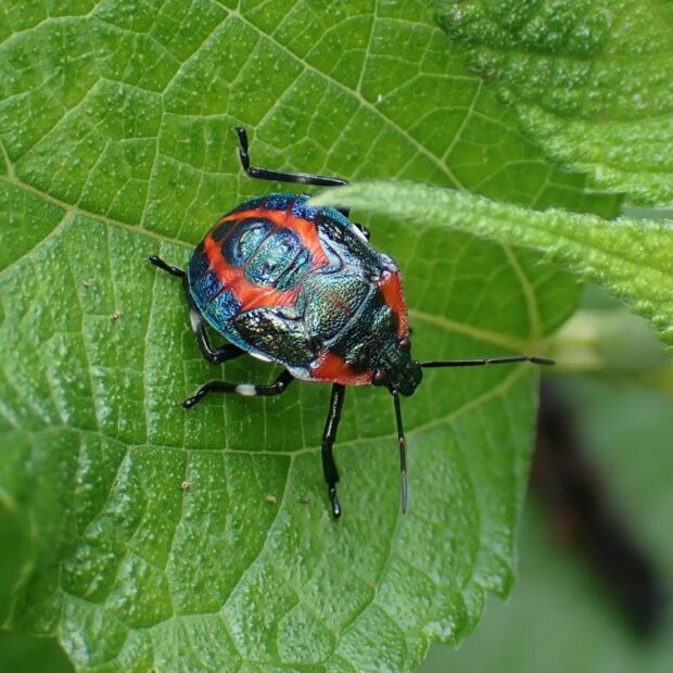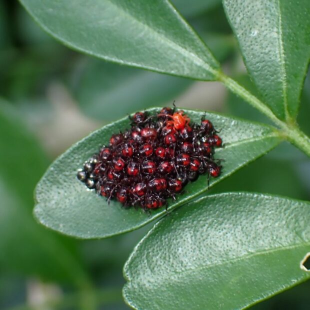 別名ハリクチブトカメムシ。 胸にとがったトゲを持つクチブトカメムシの仲間。 主に肉食性で、 太い口吻でガやハムシなどの幼虫の体液を吸いますが、 植物も食べることが知られています。