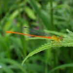 腹部がオレンジ色で複眼が緑色のイトトンボ。 九州では分布域が北上しています。 ベニイトトンボに似ていますが、 本種はほっそりしており、 複眼の緑色味が強く、 メスは腹部先端の背面(第7~10節)に黒色斑があります。 メスはオスと連結して産卵します。