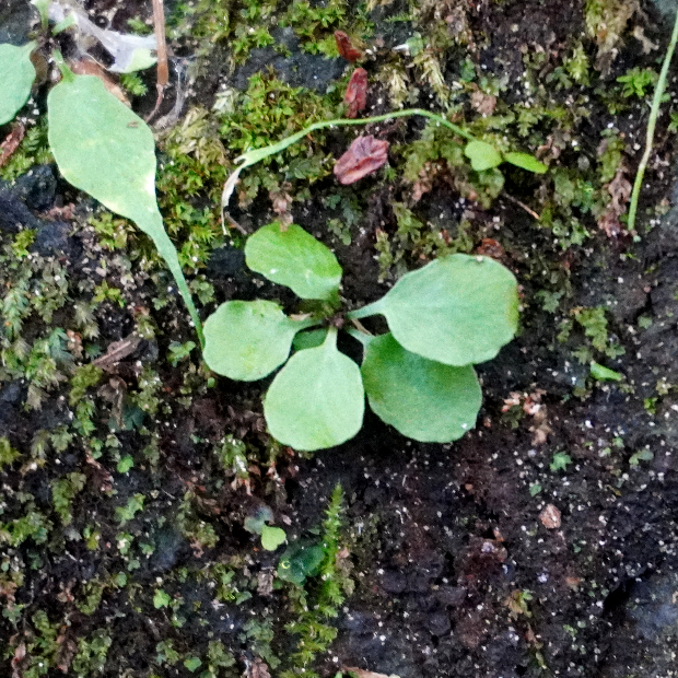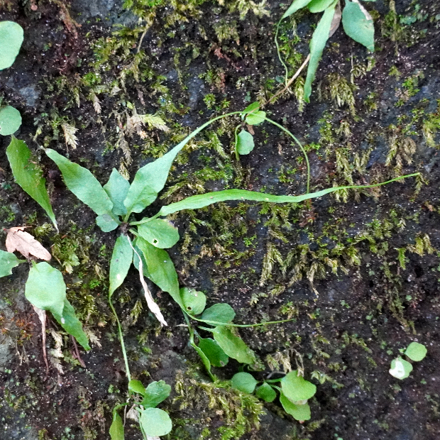 クモノスシダは英名で「Asian Walking Fern」、 直訳してアジアの歩くシダといいます。 北米産の近縁種はそのまま「Walking Fern」。 葉先から新しい株、 その葉先からまた新しい株というように次々に生える姿を歩くことに例えたのでしょうか。