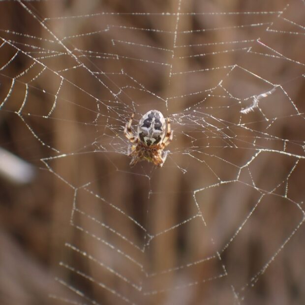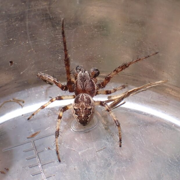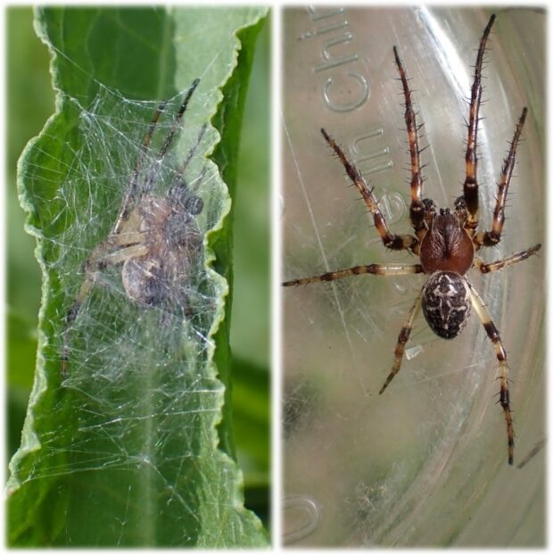 湿地でよく見かける北方系のクモ。 腹部は白っぽいものが多いですが、 全体に薄黒いものもいます。 昼間は草を丸めて作った住みかにいることが多く、 夕方になると、 まるい網を張ります。 名前はクモの研究者の中村正雄氏に因みます。