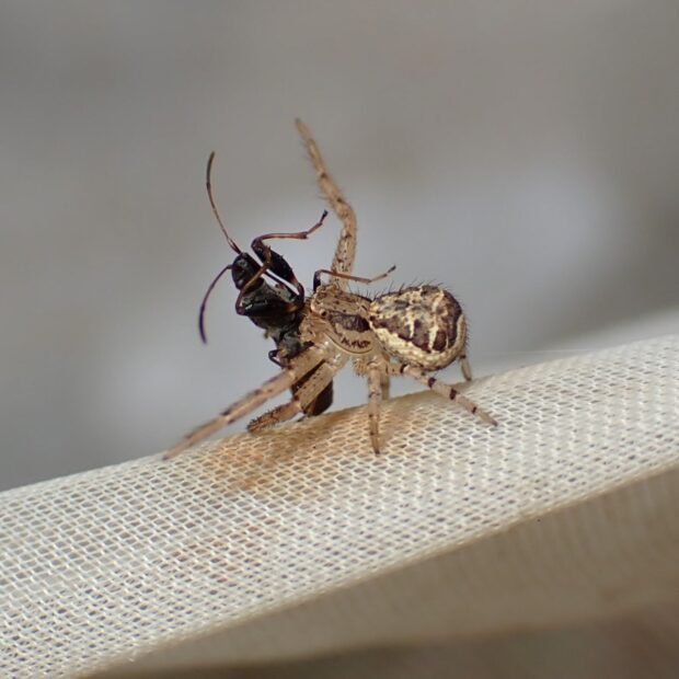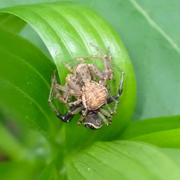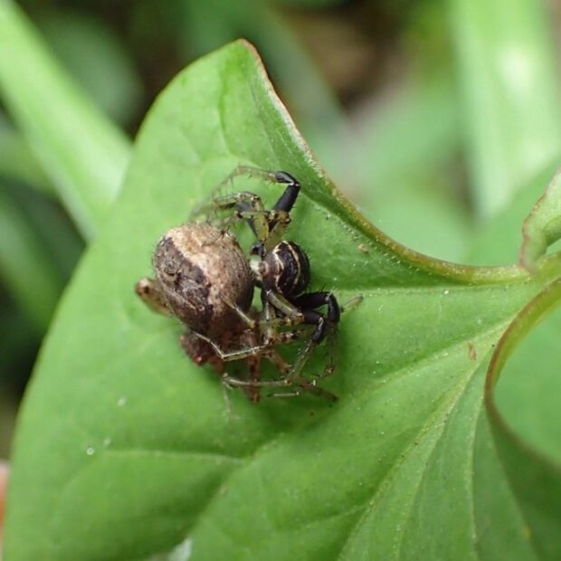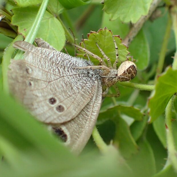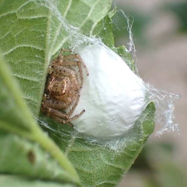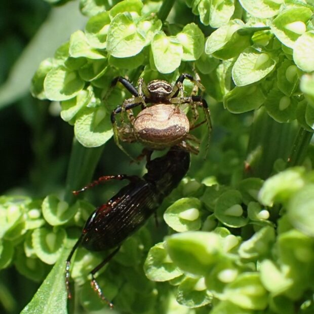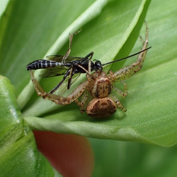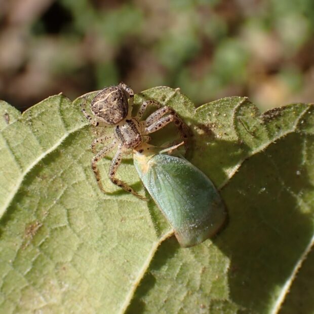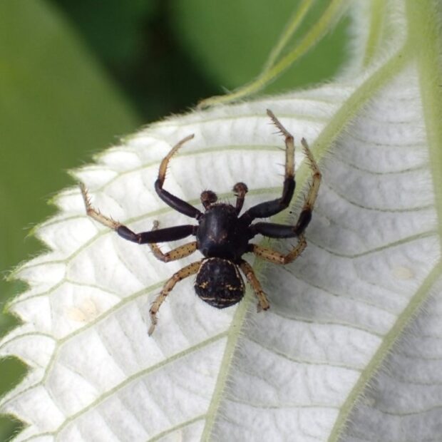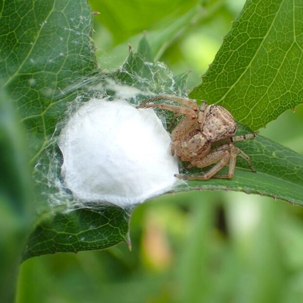 都市部~山地まで、 普通に見られるカニグモの仲間。 網を張らず、 獲物を待ち伏せて捕えます。 幼体で越冬し、 春から初夏にかけて成体になります。 カニグモ属は似ているものが多く、 識別には注意が必要。