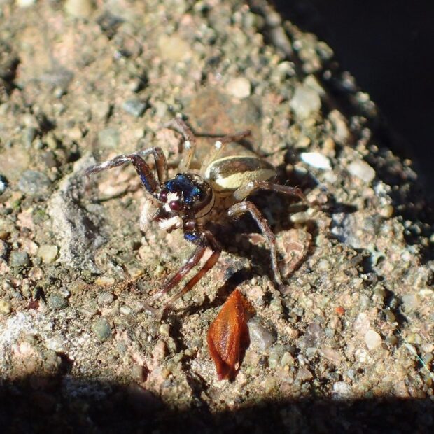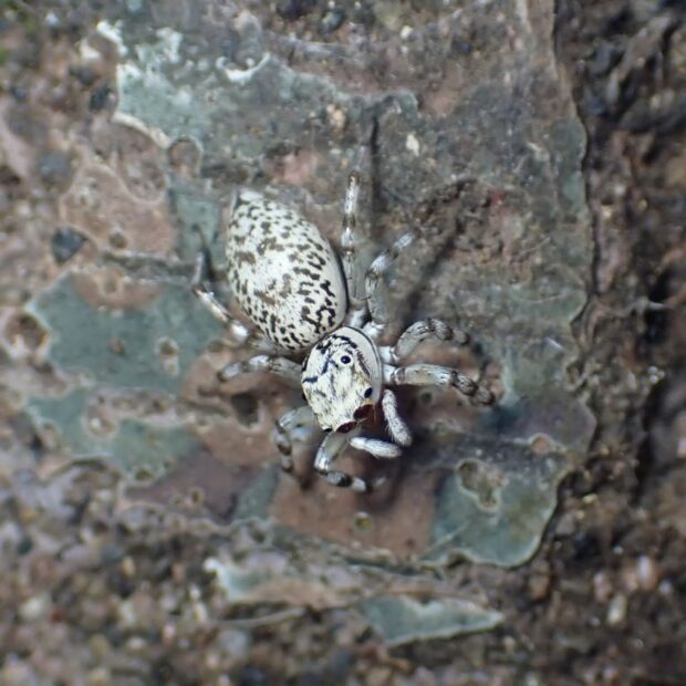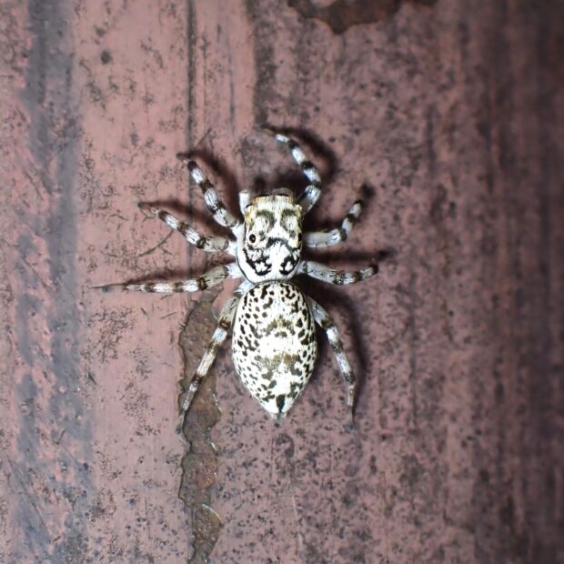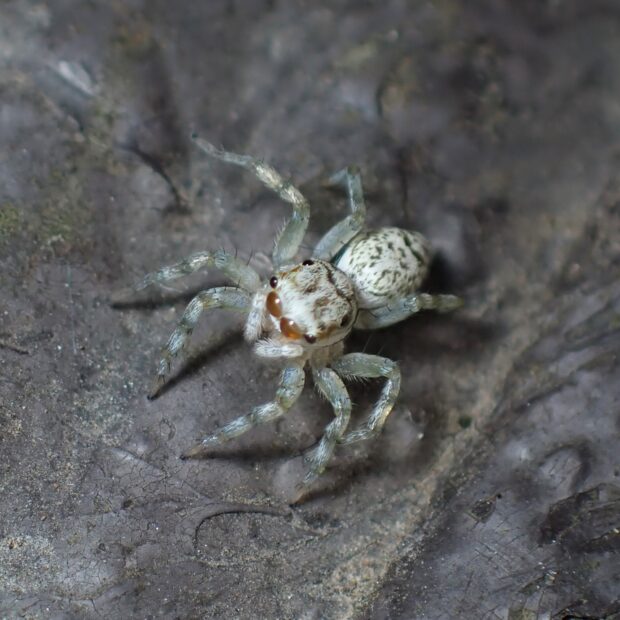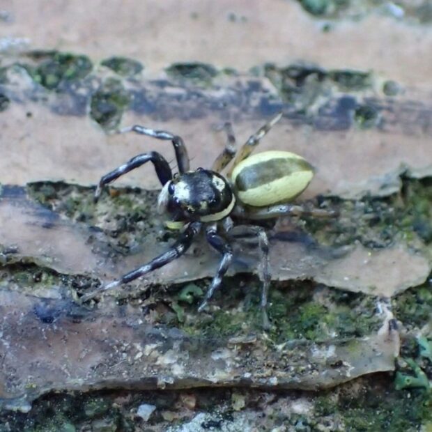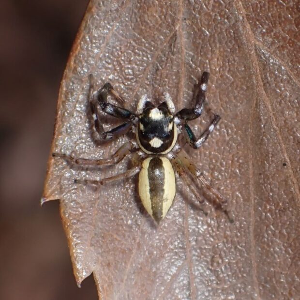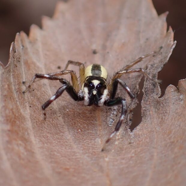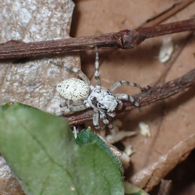 オスとメスで全く姿が違うハエトリグモ。 メスの体色は白く、 複雑な黒い斑紋がありますが、 斑紋には個体差があります。 オスの体色は黒く、 白い紋やクリーム色の線があります。 オスの幼体、 亜成体はメスと同じような姿をしています。 草地や樹林地で見られます。