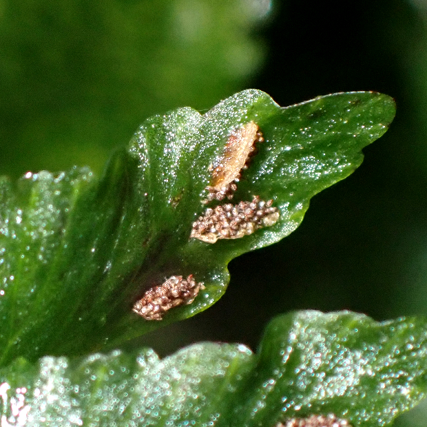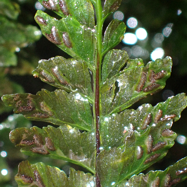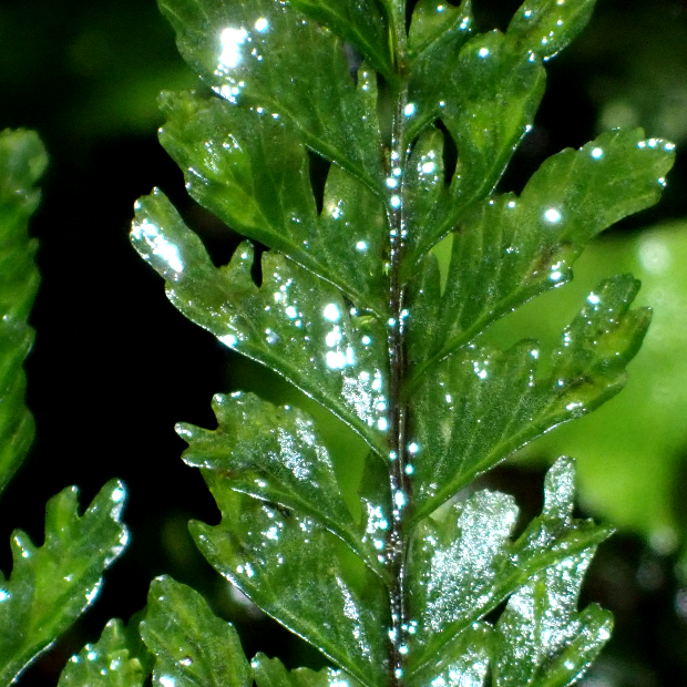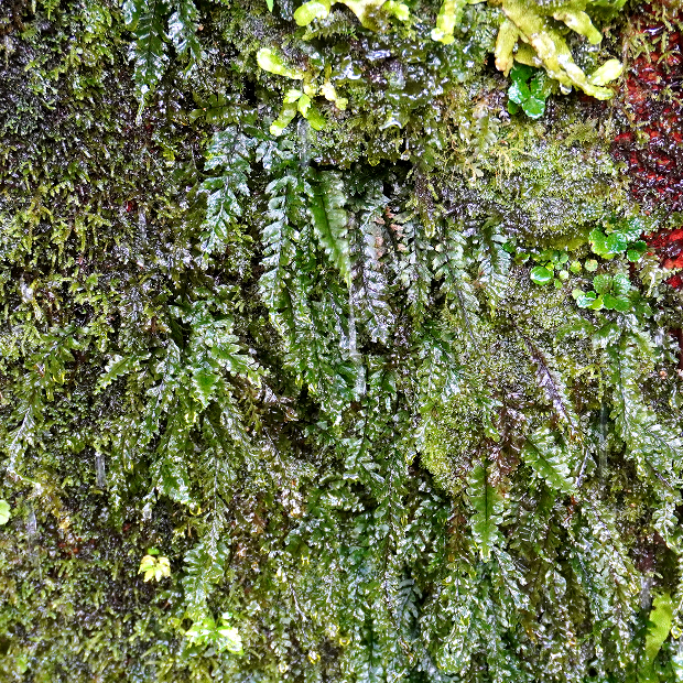 主に水の滴れる崖に生えるホウビシダの仲間のシダ。 このような場所に適応するために、 葉はとても薄い構造をしています。 名前には屋久島とつきますが、 それ以外の地域でも見られます。