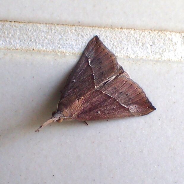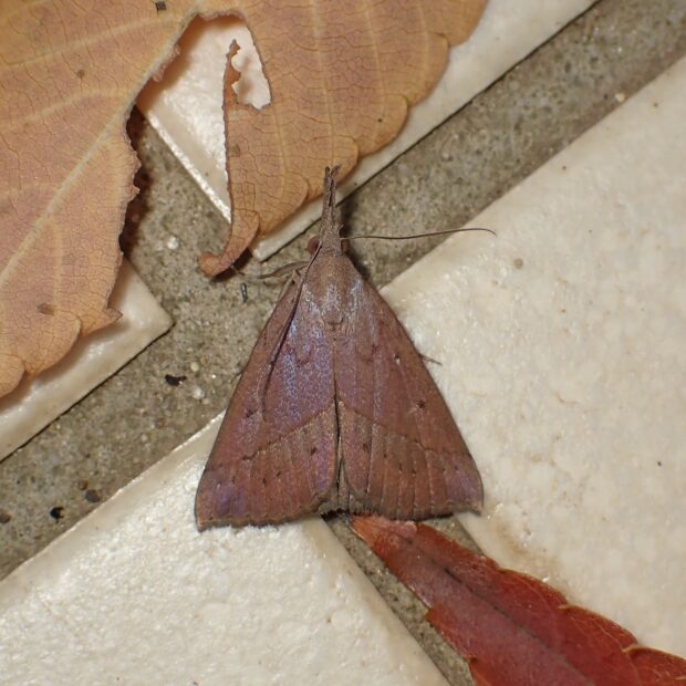ヤガ科アツバの仲間。 秋になると増え、 街中で普通に見られます。 とまると三角形で、 下唇(かしん)ひげ(パルピともいう)が長く伸びています。 青紫に光るものや、 茶色いものなど変異が見られます。 秋に現れ、 成虫で越冬します。
