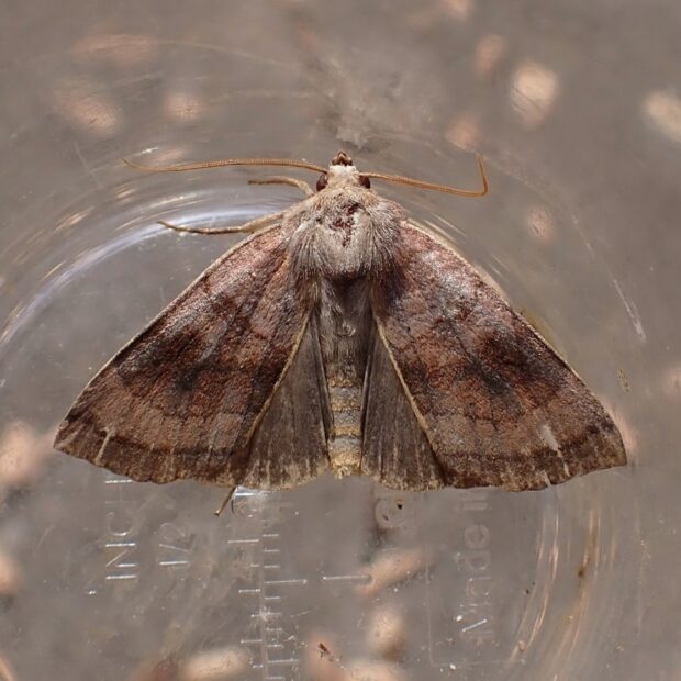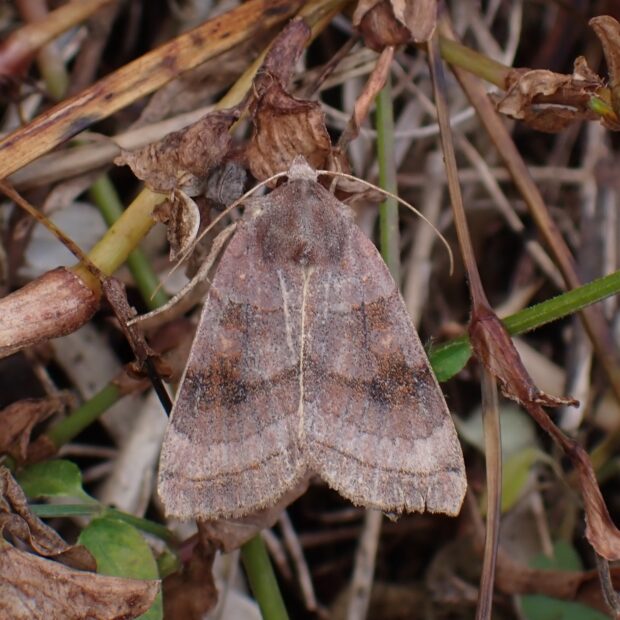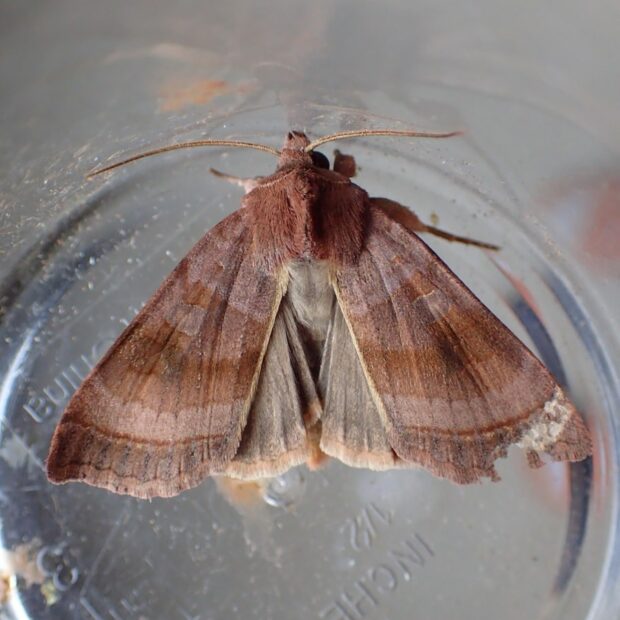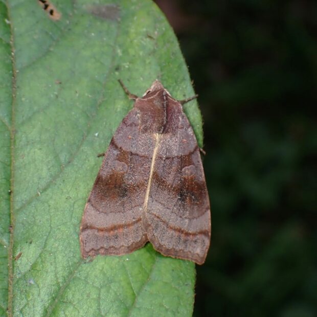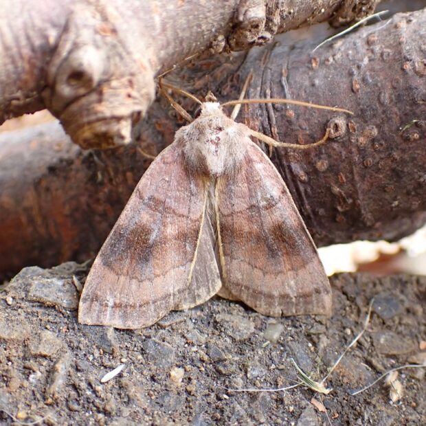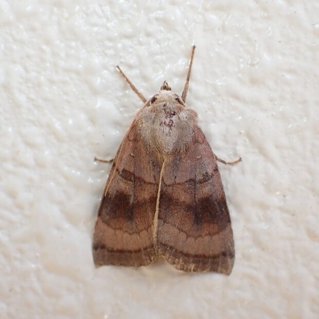秋に現れるヤガ科モンヤガの仲間。 はねの先端がとがっている薄い茶色のガ。 市街地で普通に見られ、 明かりにやって来ます。 幼虫で越冬します。