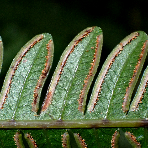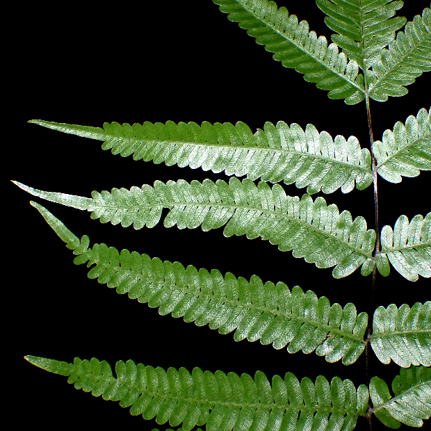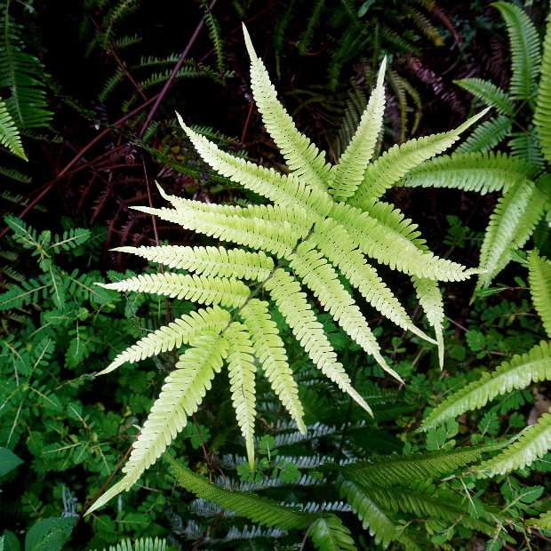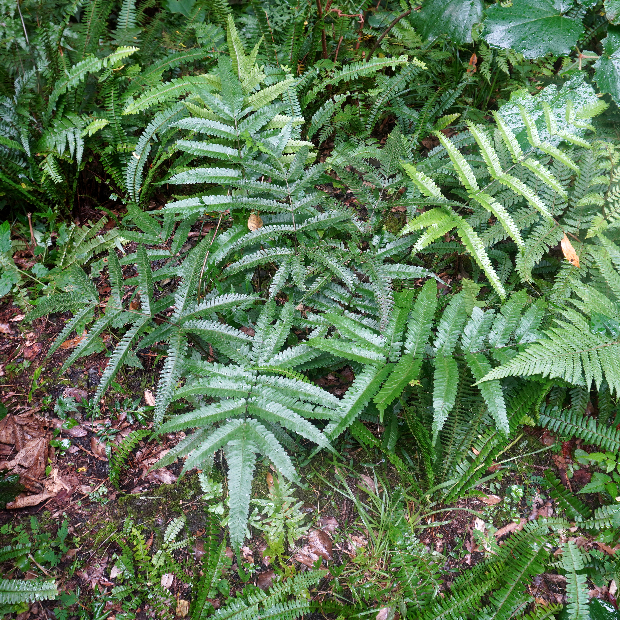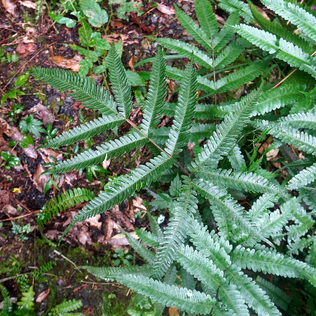 東京都八丈島が由来の南方に生えるシダ。 ハチジョウシダの仲間はどれもよく似ていて見分けるのが難しいです。 本種は葉が厚めで、 羽片の基部が少し縮むこと、 葉柄基部に鱗片が多く残ることなどが特徴です。