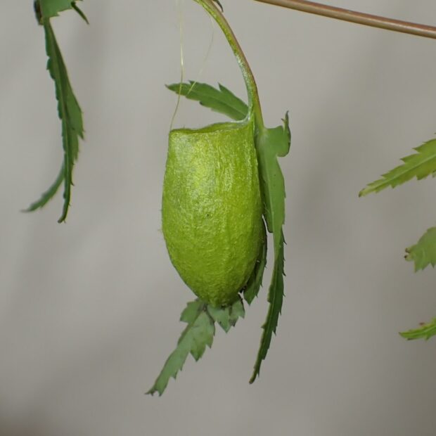 • 長い柄のついた黄緑色の空繭(中はからっぽ)。