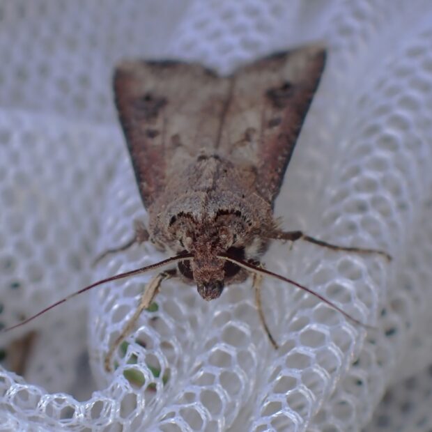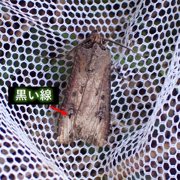 ヤガ科モンヤガの仲間。 幼虫は芝が大好物。 また、 幼虫は野菜苗を根元から切断することから、 ネキリムシと呼ばれます。 幼虫は、 大きくなると縦に掘った孔にひそみ、 夜になると出てきて葉を食べます。