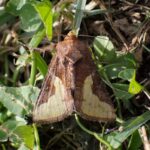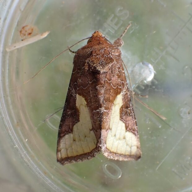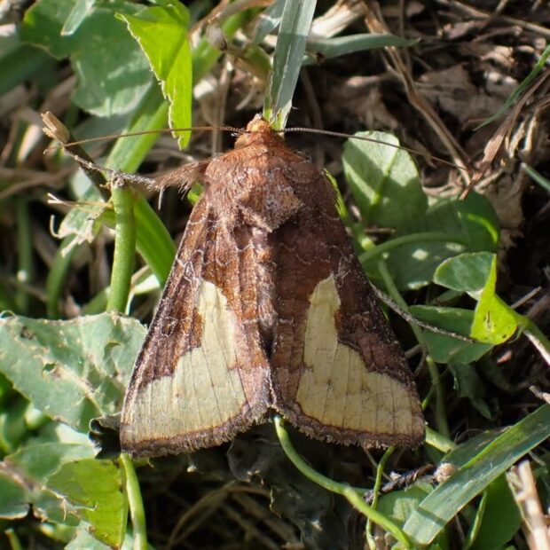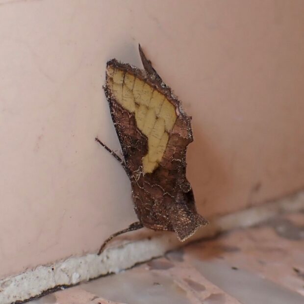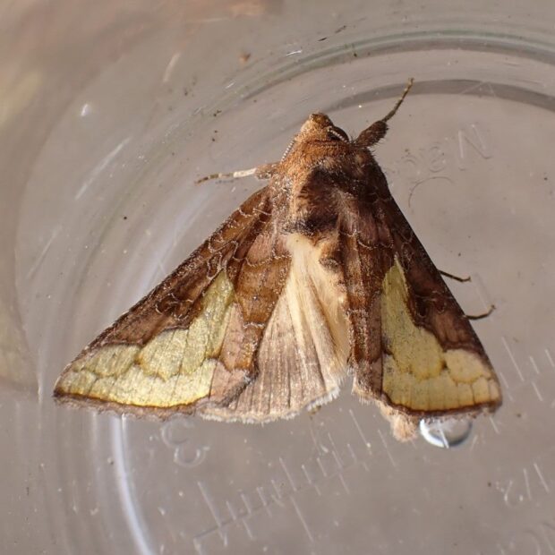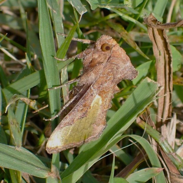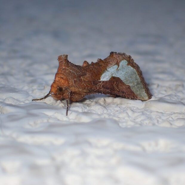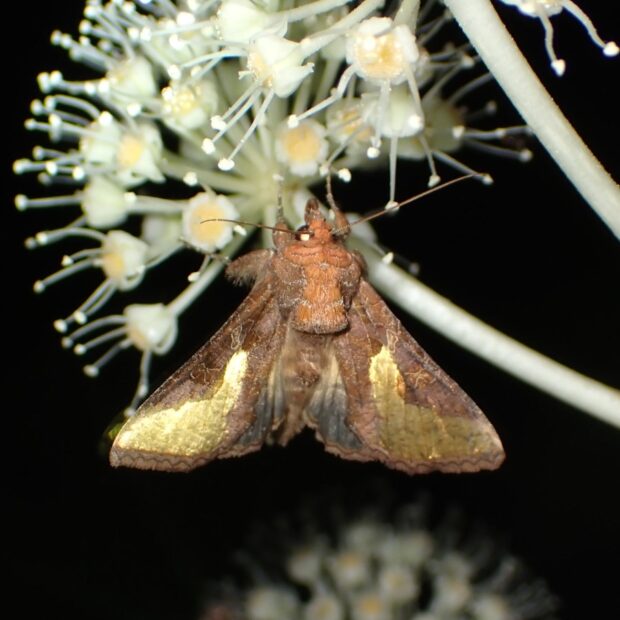 ヤガ科キンウワバの仲間。 茶褐色の前ばねには、 大きな金色の紋があり、 光があたると輝きます。 胸の背には、 トサカのような毛の束が立っています。 都市部などでも普通に見られます。