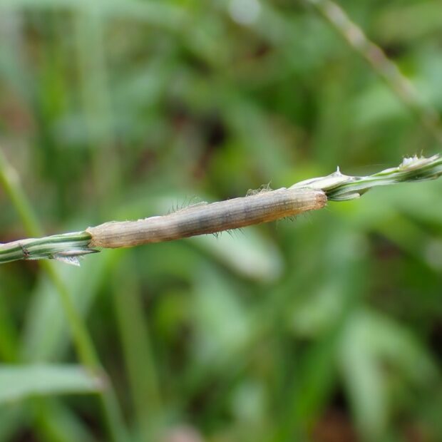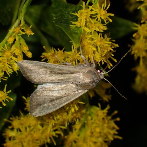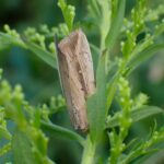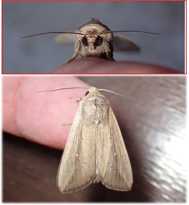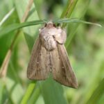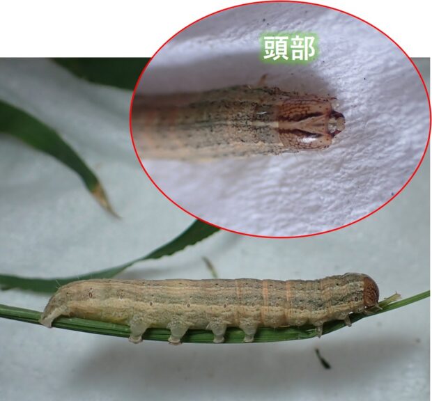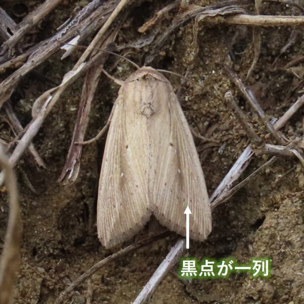ヤガ科ヨトウガの仲間。 幼虫はイネなどイネ科植物を食べます。 スジシロキヨトウやニセスジシロキヨトウに似ていますが、 本種は、 前ばねの黒点が1列に並び、 後ばねが白いという特徴があります。