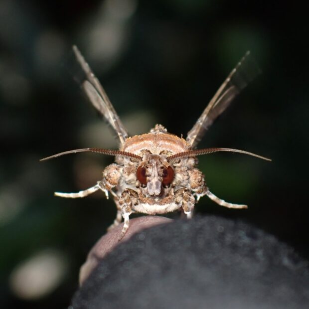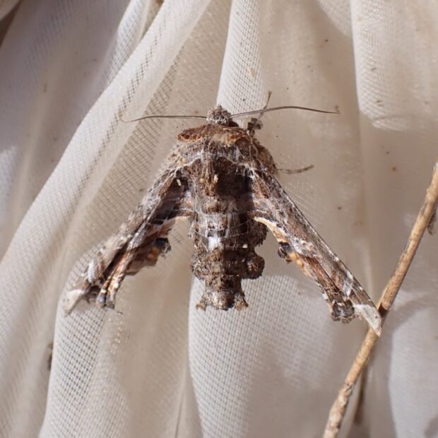 ヤガ科の仲間。 まだら模様のはねを扇子のように折りたたんでとまりますが、 広げると普通のはねの形をしています。 お尻をあげてとまる姿も特徴的。 コフサヤガと似ていますが、 本種はやや大きく、 オスは触角がくし歯状、 後ばねの基部がやや黄色味を帯びています。