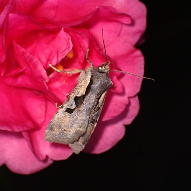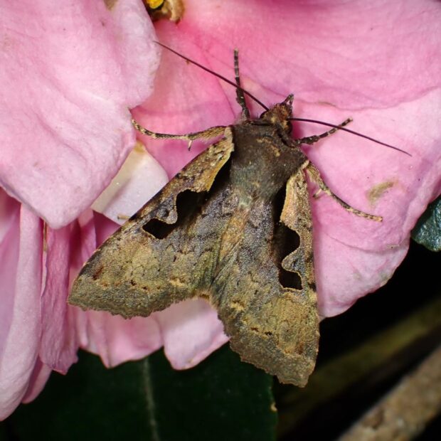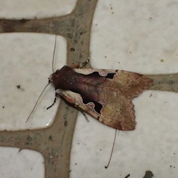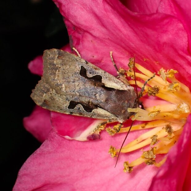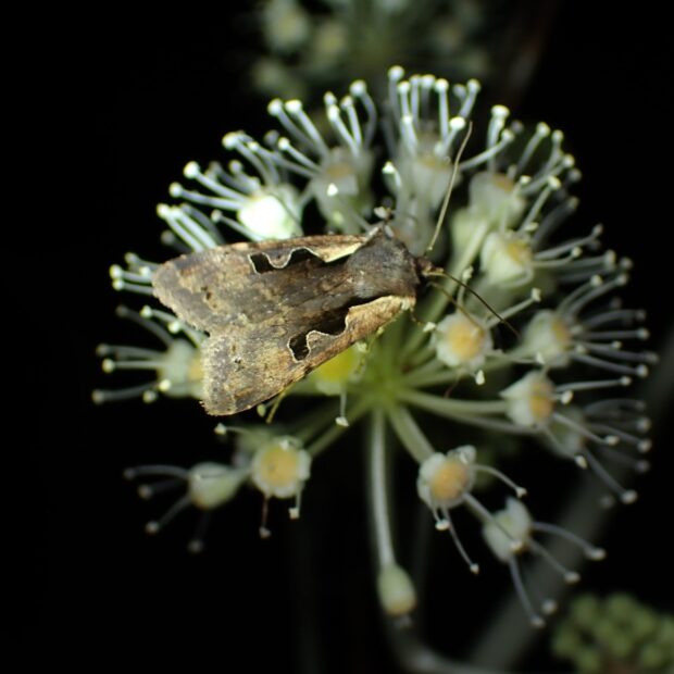 晩秋から初冬に見られるヤガ科キリガの仲間。 前ばねの黒い模様が特徴的。 もとは1種だったものが3種に分かれました(スギタニモンキリガ、 ヤマノモンキリガ、 スミレモンキリガ)。 識別には注意が必要ですが、 本種は普通に見られます。