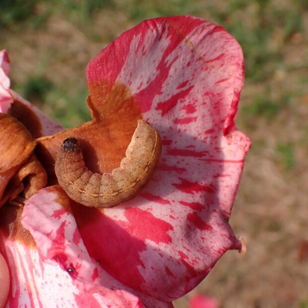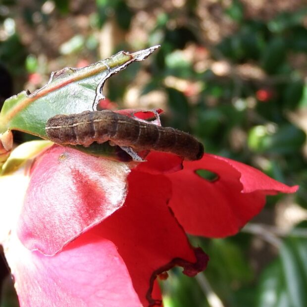 • 幼虫。 ツバキの花に潜りこみ雄しべ、 雌しべ、 花びらを食べる。 その後、 地中に潜る