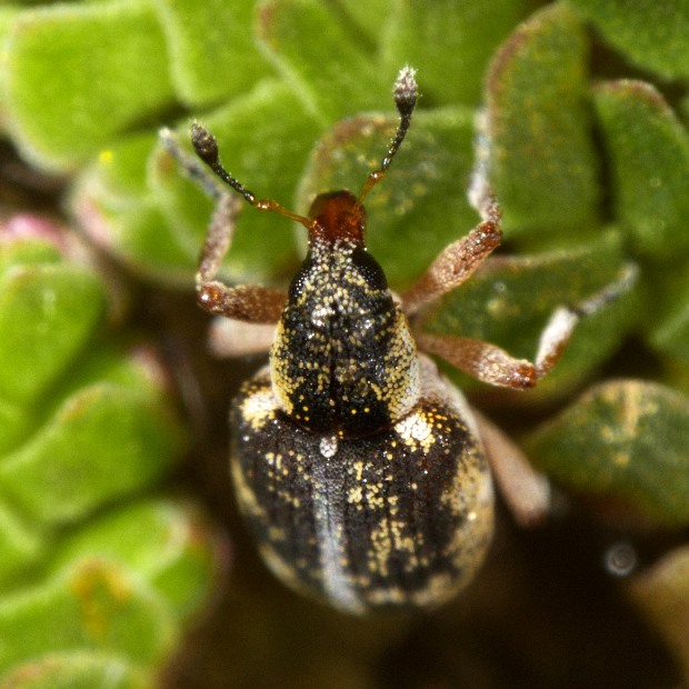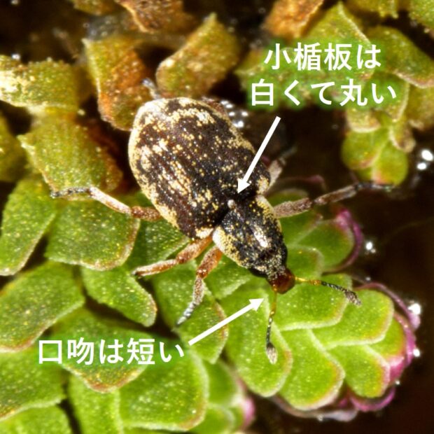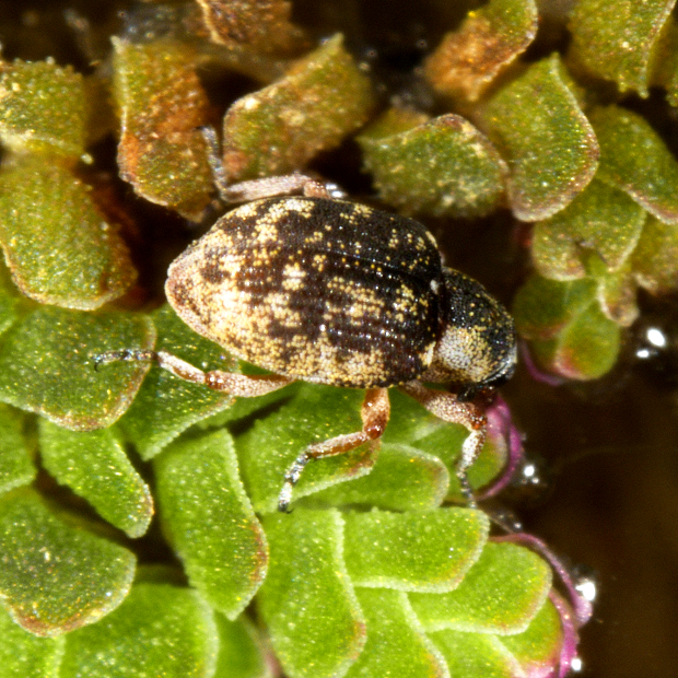 水路、 水田、 ため池などで見られる北米原産のまだら模様の小さなゾウムシ。 日本では1987年に茨城県で発見されました。 各地で大発生している外来種のアゾラ(アイオオアカウキクサなど)を食べることから、 本種の分布が注目されています。