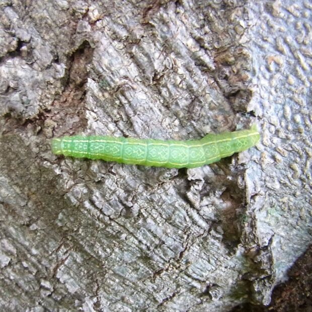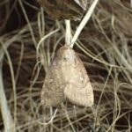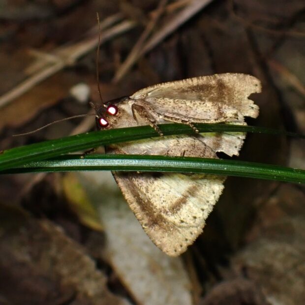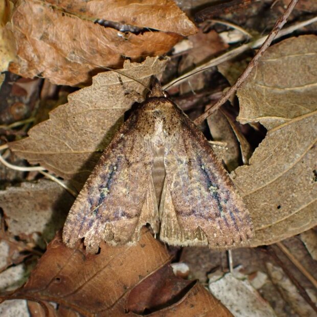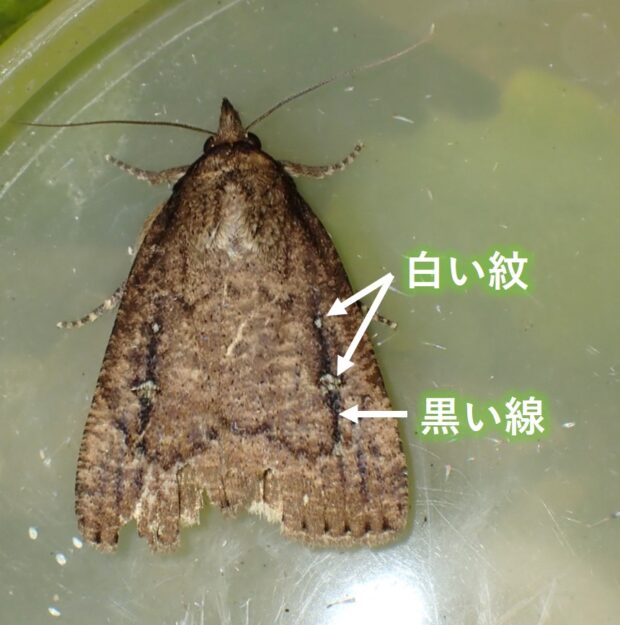 ヤガ科シタバガの仲間。 茶色の前ばねに黒い帯があり、 白い紋が並ぶのが特徴。 6月頃にあらわれ、 暑い夏はほとんど活動をせず、 成虫で越冬します。
