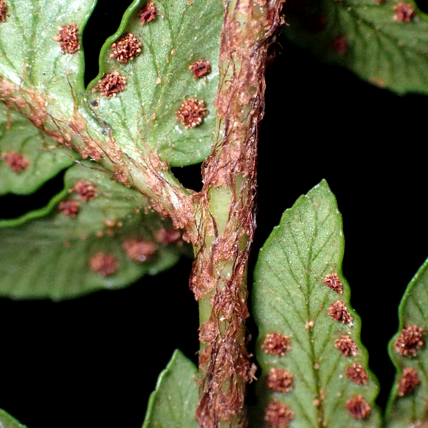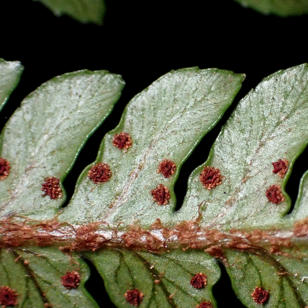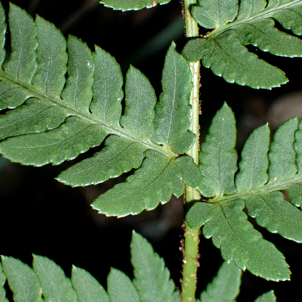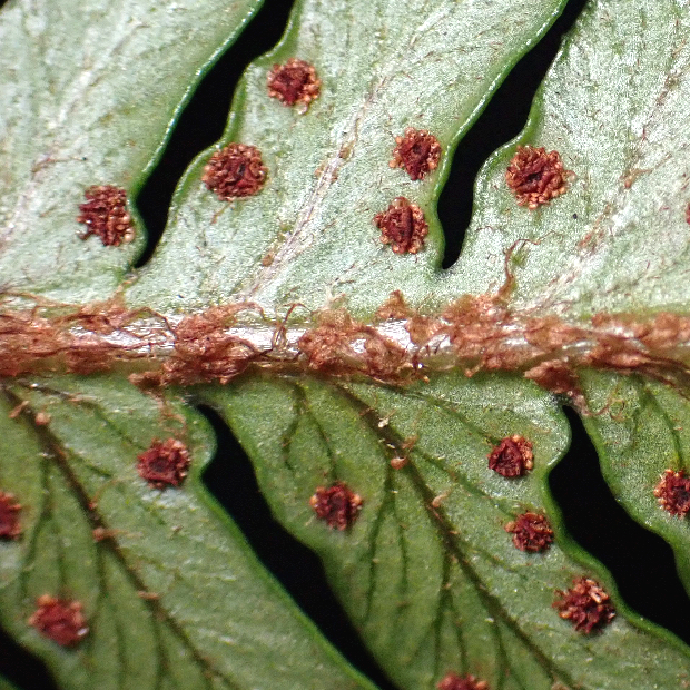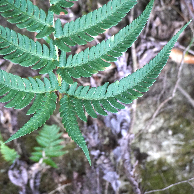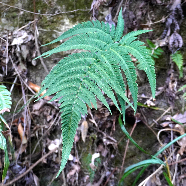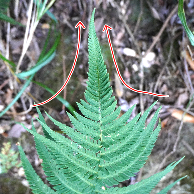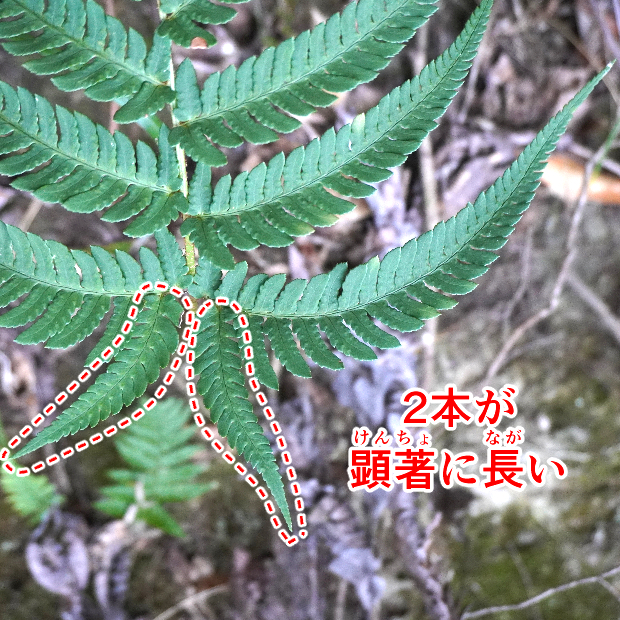 南側の太平洋沿いに多いシダ。 オオイタチシダによく似ていますが、 葉先と中央一番下の小羽片2本がヤリのように長くなります。 そのほか包膜のフチに毛状突起が多く、 葉柄基部の鱗片がふつう赤っぽくて、 羽軸の鱗片基部がより平面的になることも違いです。