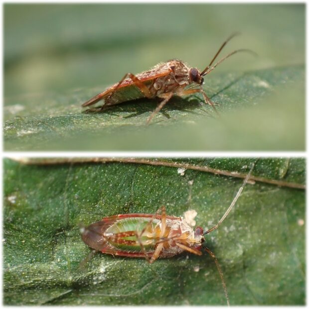 毛深くまだら模様のカスミカメムシ。 カスミカメムシは小さなものが多く、 花やつぼみ、 種子、 果実、 若い茎や葉の汁を好んで吸います。 ケブカカスミカメの仲間は日本には6種が分布し、 いずれも体は茶色で細長く、 毛でおおわれています。 明かりにやって来ます。