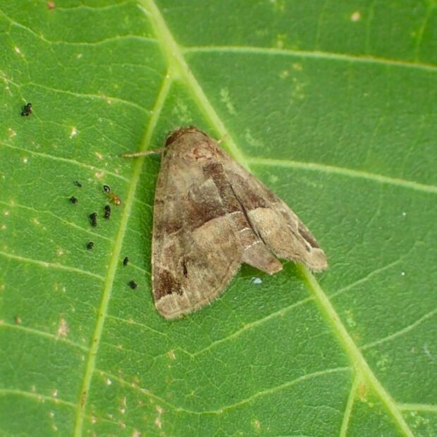 ヤガ科ヒメヨトウの仲間。 カナムグラが生い茂る草地で普通に見られます。 茶色の前ばねの真ん中に濃い茶色の帯があり、 お尻をあげてとまる姿は特徴的です。