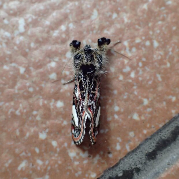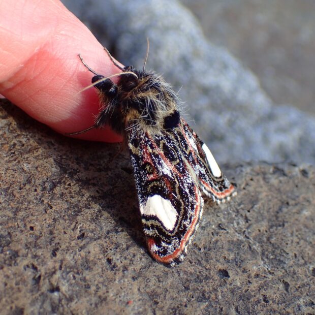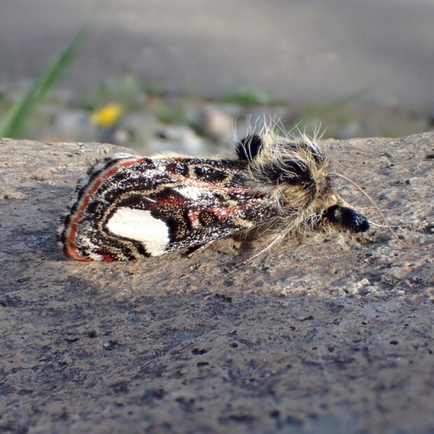 春に現れるヤガ科トラガの仲間。 前ばねはいろいろな色が混じった複雑な模様をしており、 大きな白い紋が特徴です。 胸とあしに青いふさふさした毛のかたまりがあります。