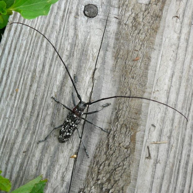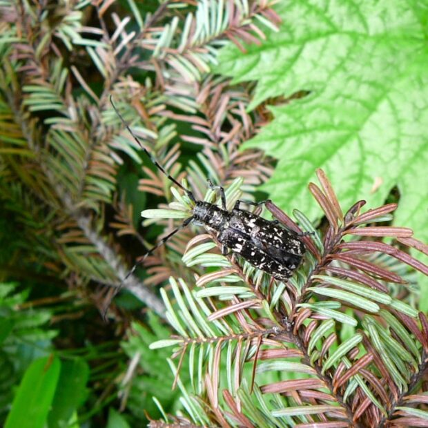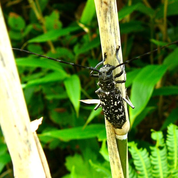 亜高山帯の針葉樹林に生息するカミキリムシ。 マツの仲間の伐採木に集まります。 体は黒色で白い点々が散らばります。 ゴマダラカミキリに似ていますが、 本種の白い斑紋は細かく、 胸の横のトゲは白いです。