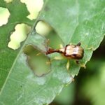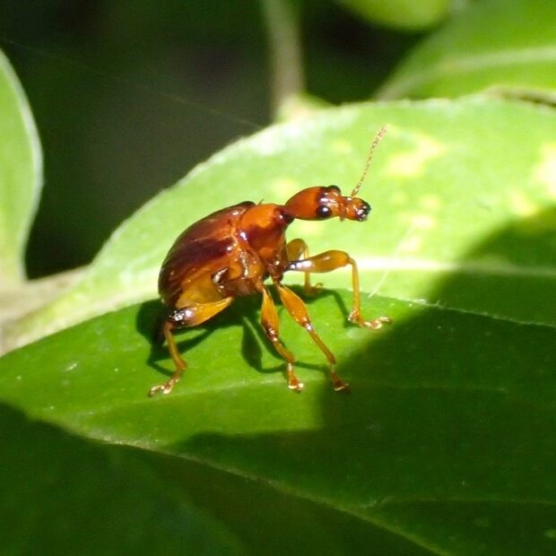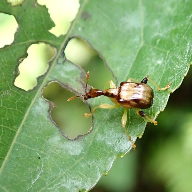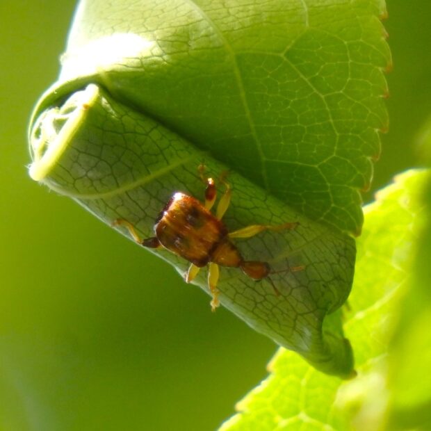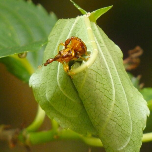 黄褐色の体に濃い色の模様があるオトシブミの仲間。 メスは、 葉をJ字状に切り、 卵を1個産み、 葉を巻いて揺籃を作ります。 幼虫は、 ゆりかごの中で、 葉を食べて育ちます。 オスとメスの形はほとんど変わりません。