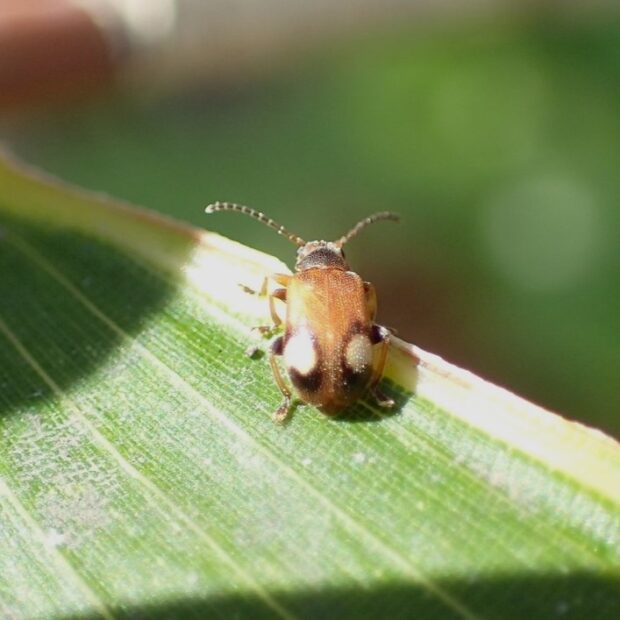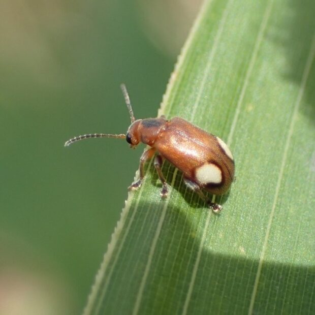 ニシキギの仲間の葉を食べるハムシの仲間。 褐色の体に、 上翅の後方にある大きな2個の目玉模様が特徴。 白い目玉模様は黒く縁どられています。 春~初夏に葉の上で見られます。