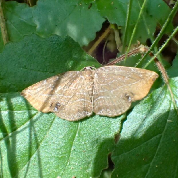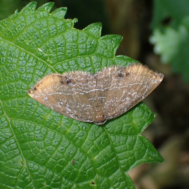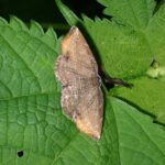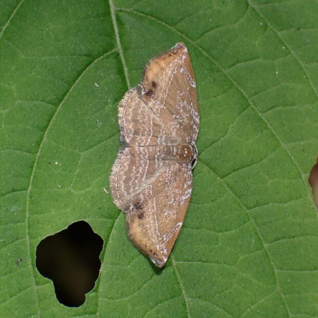 カギバガの仲間。 茶色のはねに、 複雑な青白い筋が多数はいっています。 本州以南では主に山地に生息していますが、 北海道では平地で見られます。 幼虫は黒と黄色の目立つ色をしており、 ウリノキの葉を食べます。