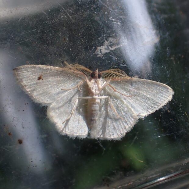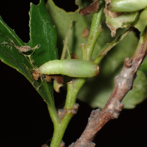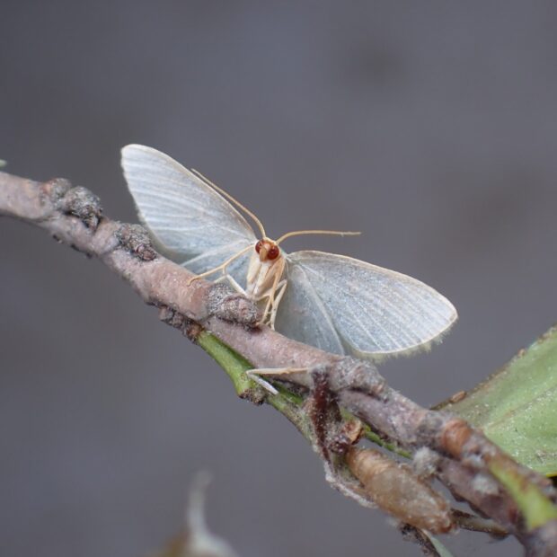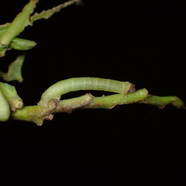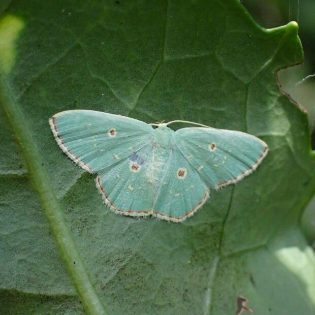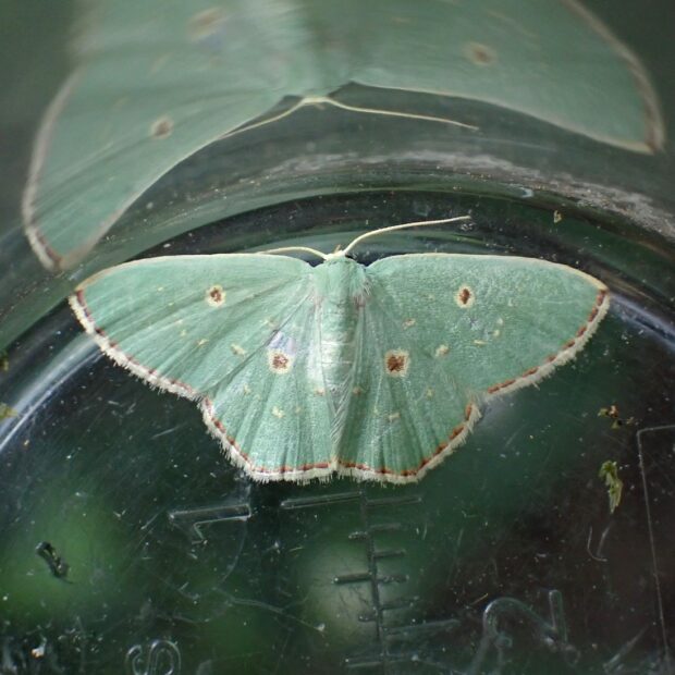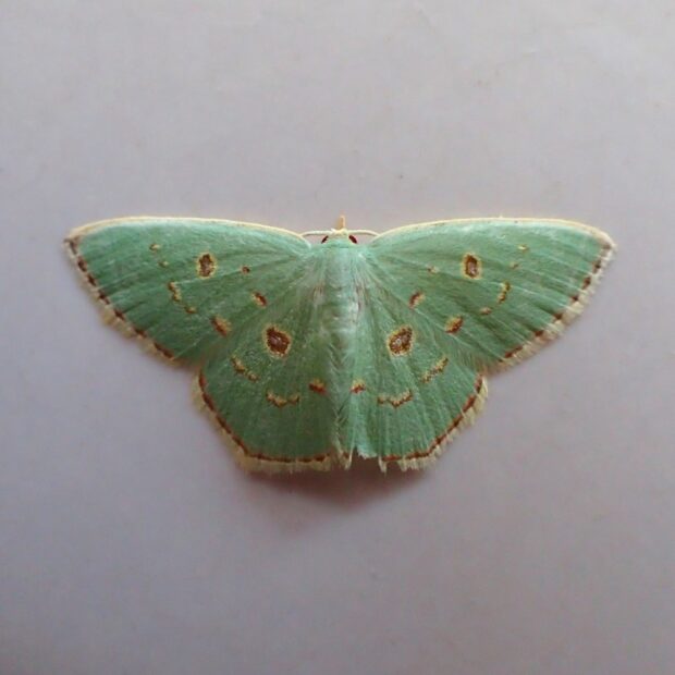 シャクガ科アオシャクの仲間。 淡い緑色の4枚のはねに、 赤い小さな紋がひとつずつあります。 幼虫はいろいろな植物のつぼみ、 花などを食べ、 平地~山地で普通に見られます。 明かりにやって来ます。