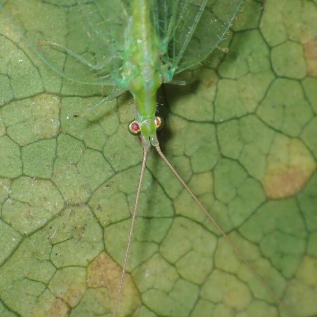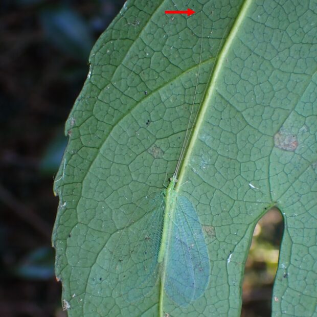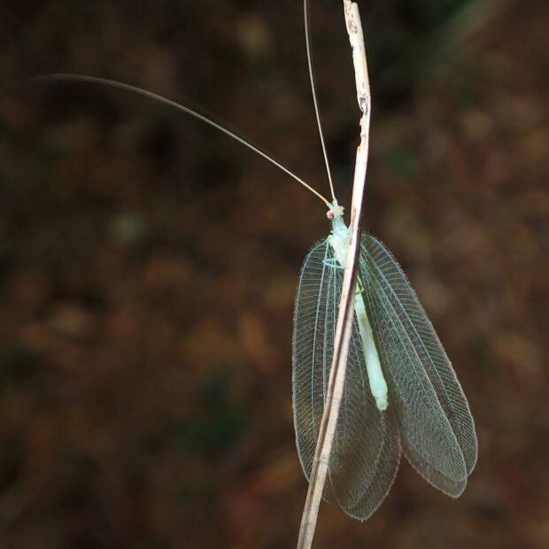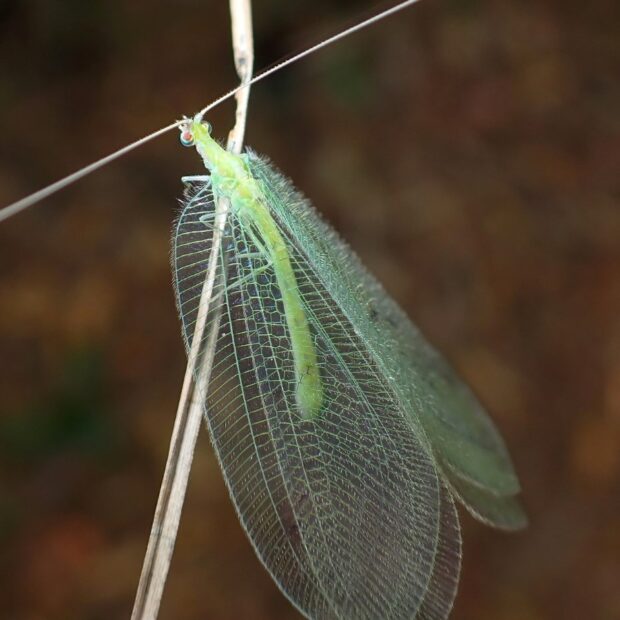 クサカゲロウの仲間。 以前はアミメカゲロウと呼ばれていました。 網目状のレースのような美しいはねをもち、 はねを平らにしてとまります。 はねに黒い紋をもつものも見られます。 冬、 葉の裏に隠れている姿を見ることが多いです。
