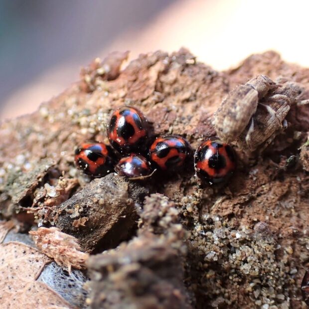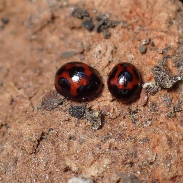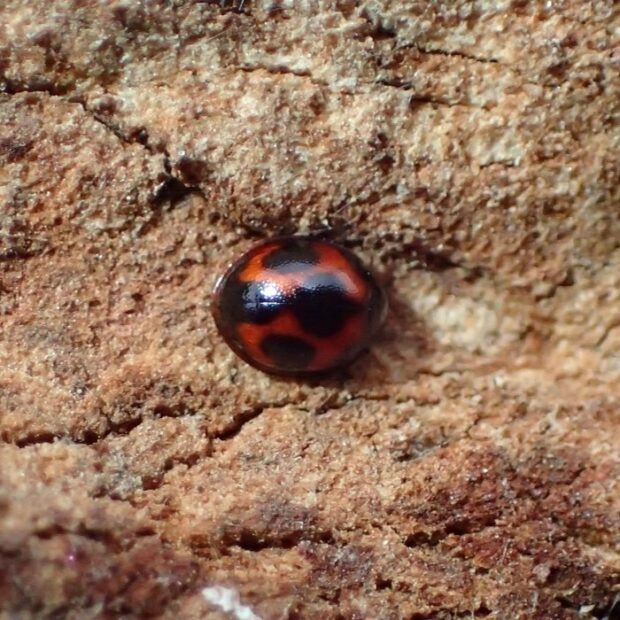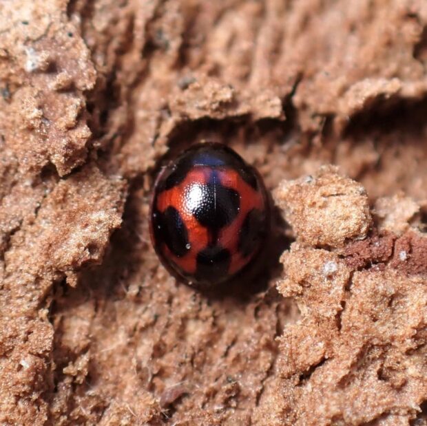 赤い上翅(じょうし)に6個の黒い紋がある小さなテントウムシ。 ケヤキの樹皮の下で、 越冬している姿を見ることが多いです。 国内ではオスは発見されておらず、 メスだけで単為生殖をしているとのことです。